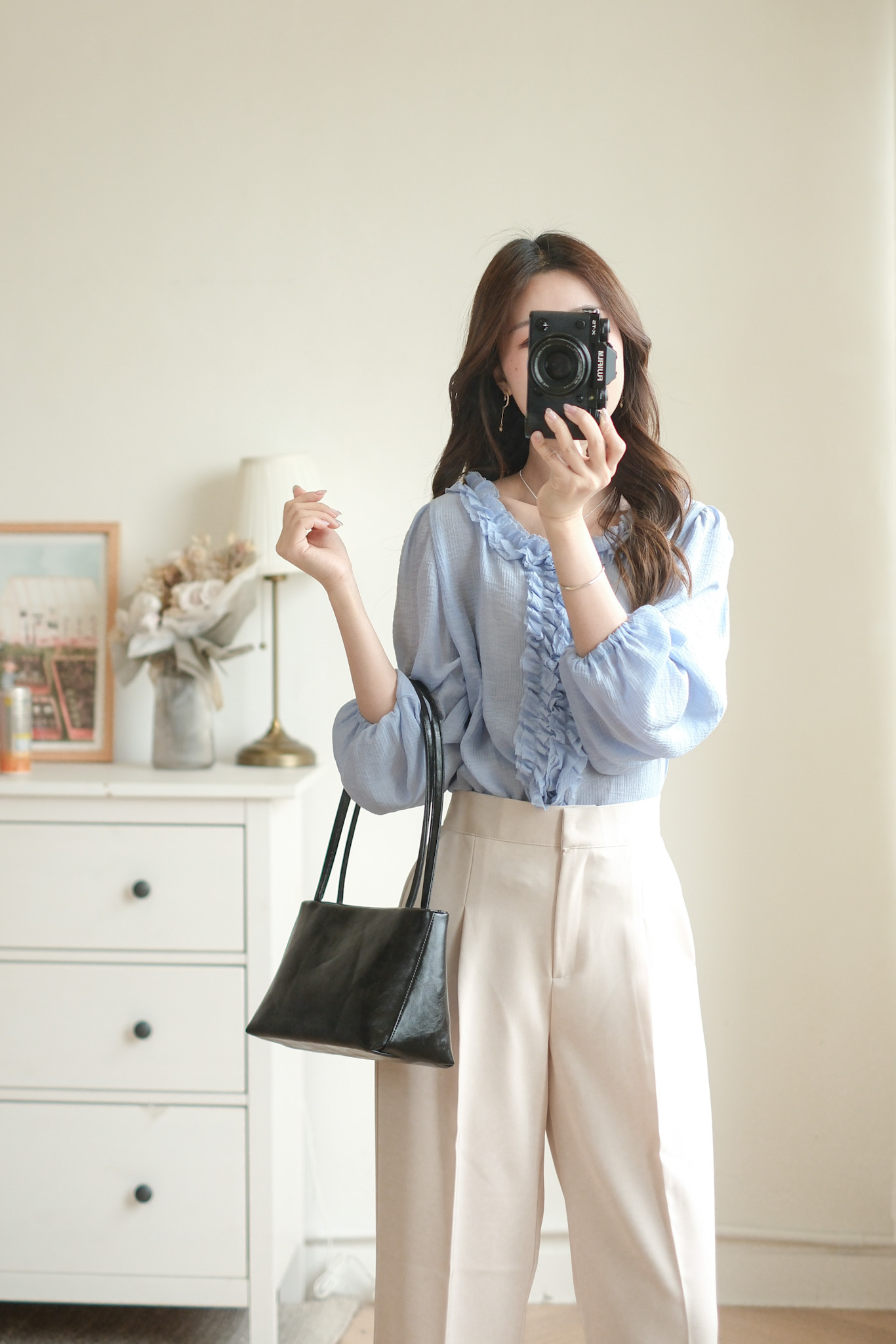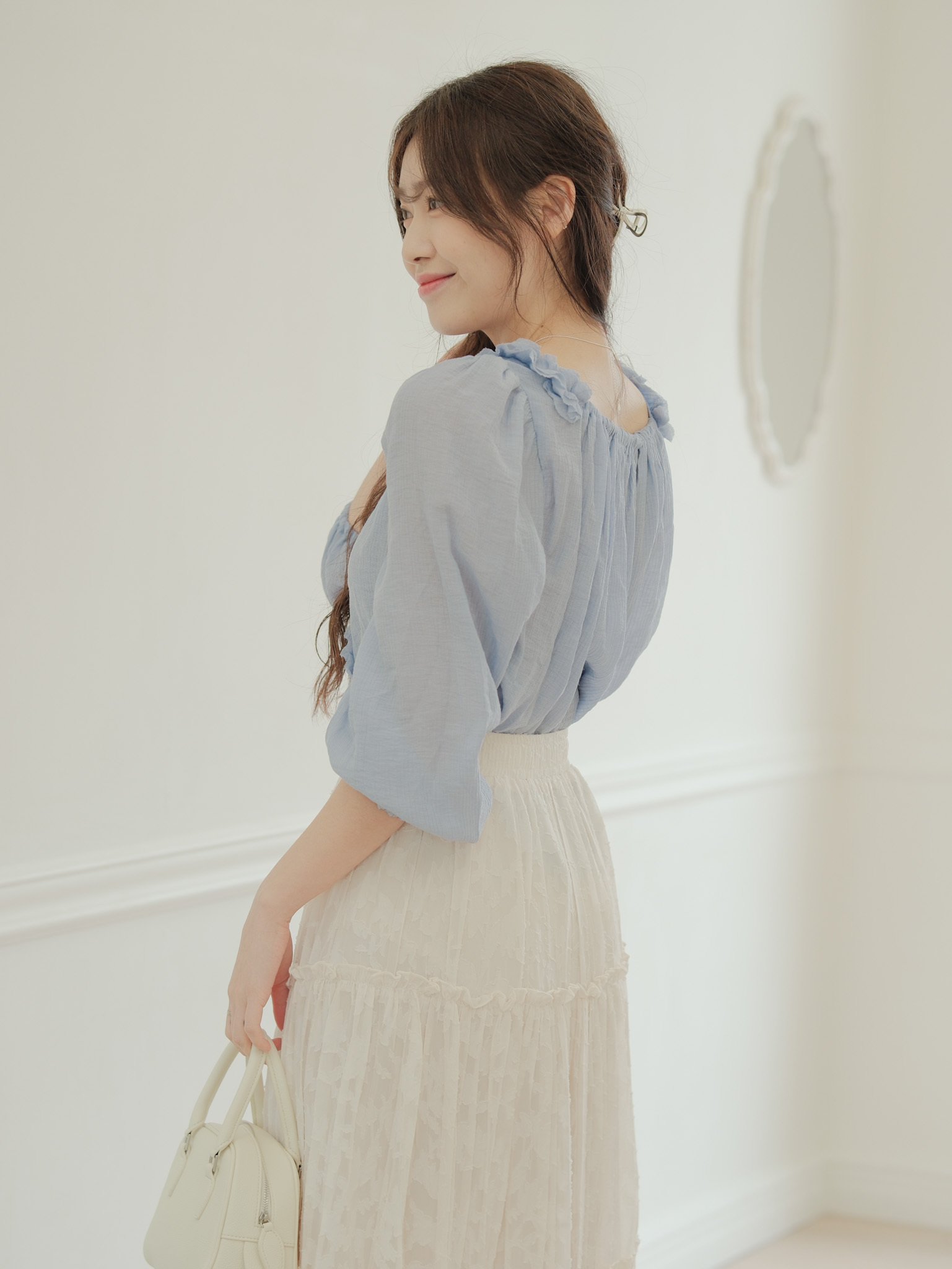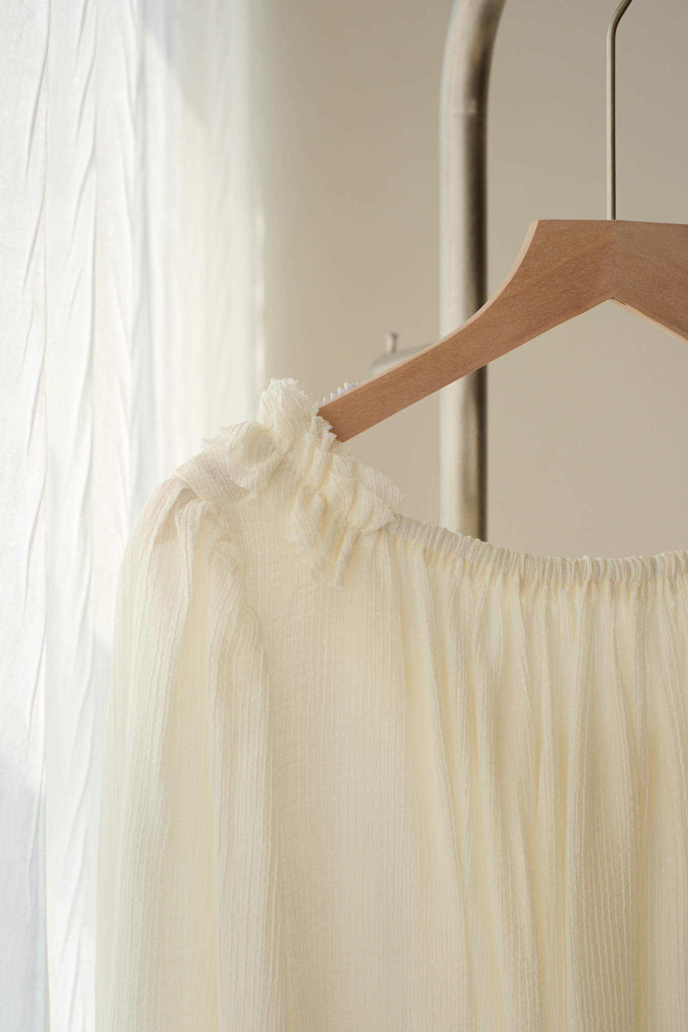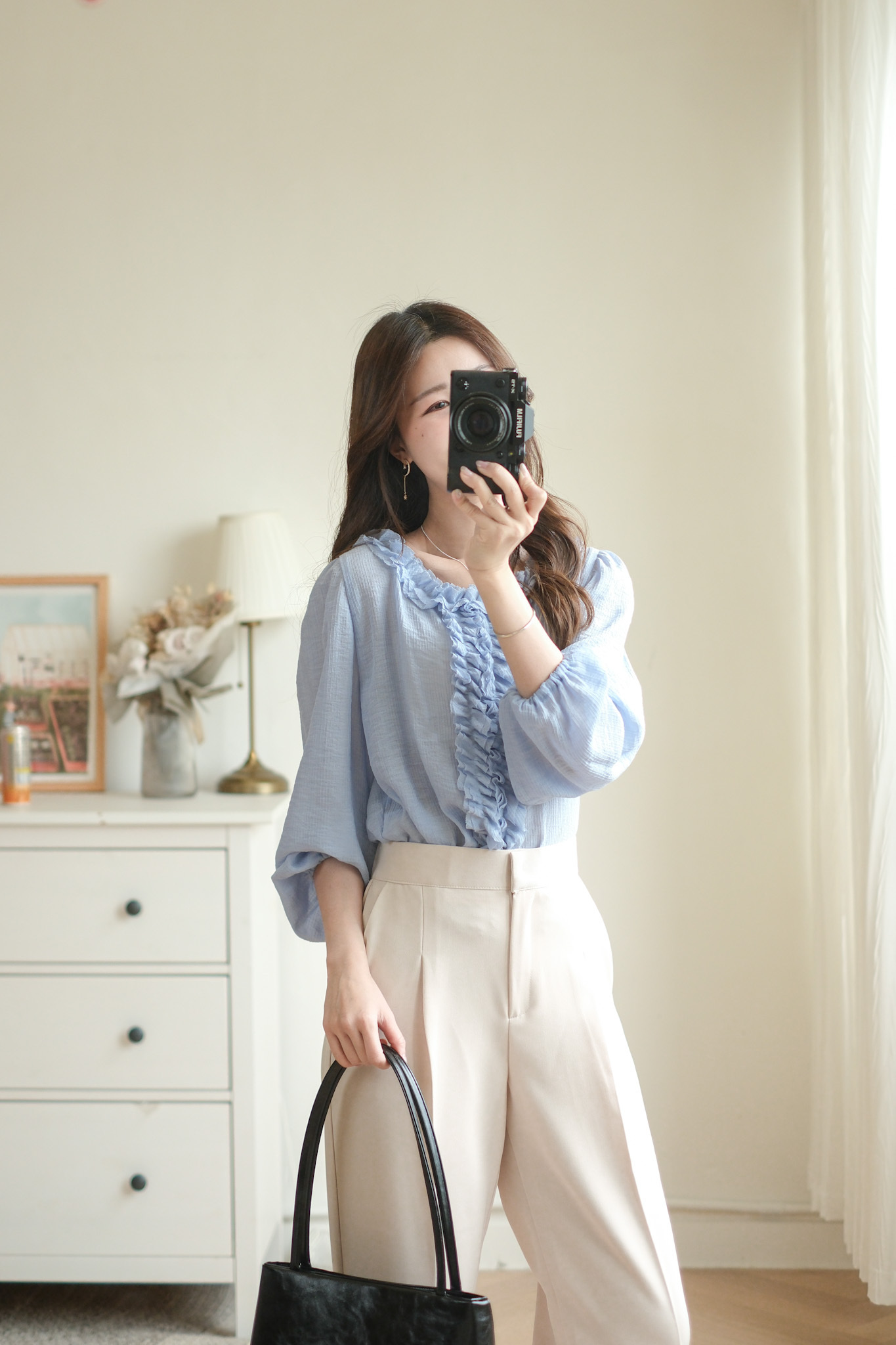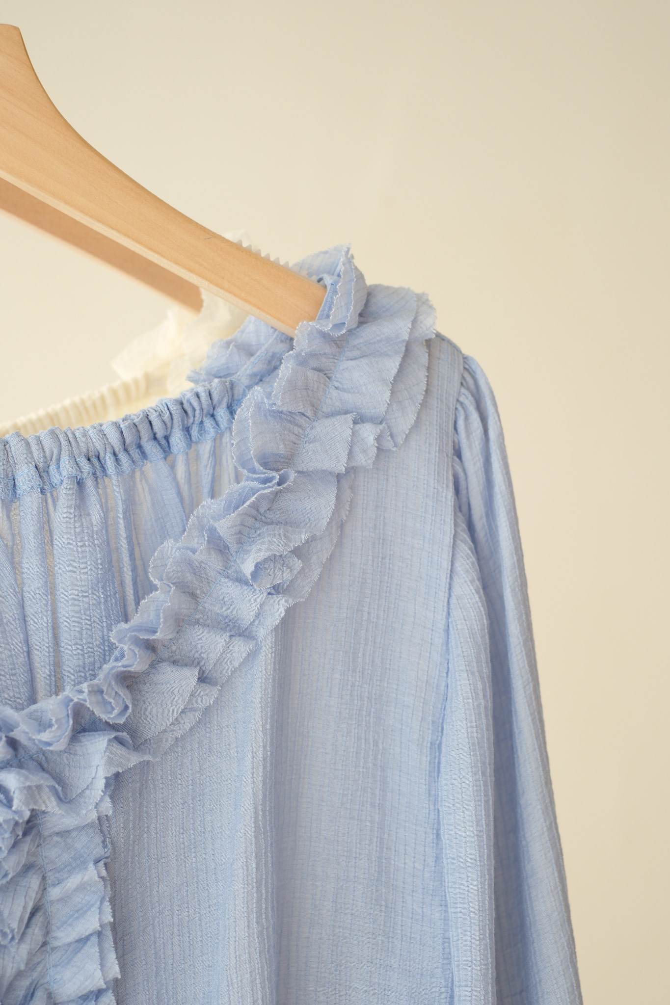 這款主要設計在於領口和衣服中間位置的木耳邊拼接