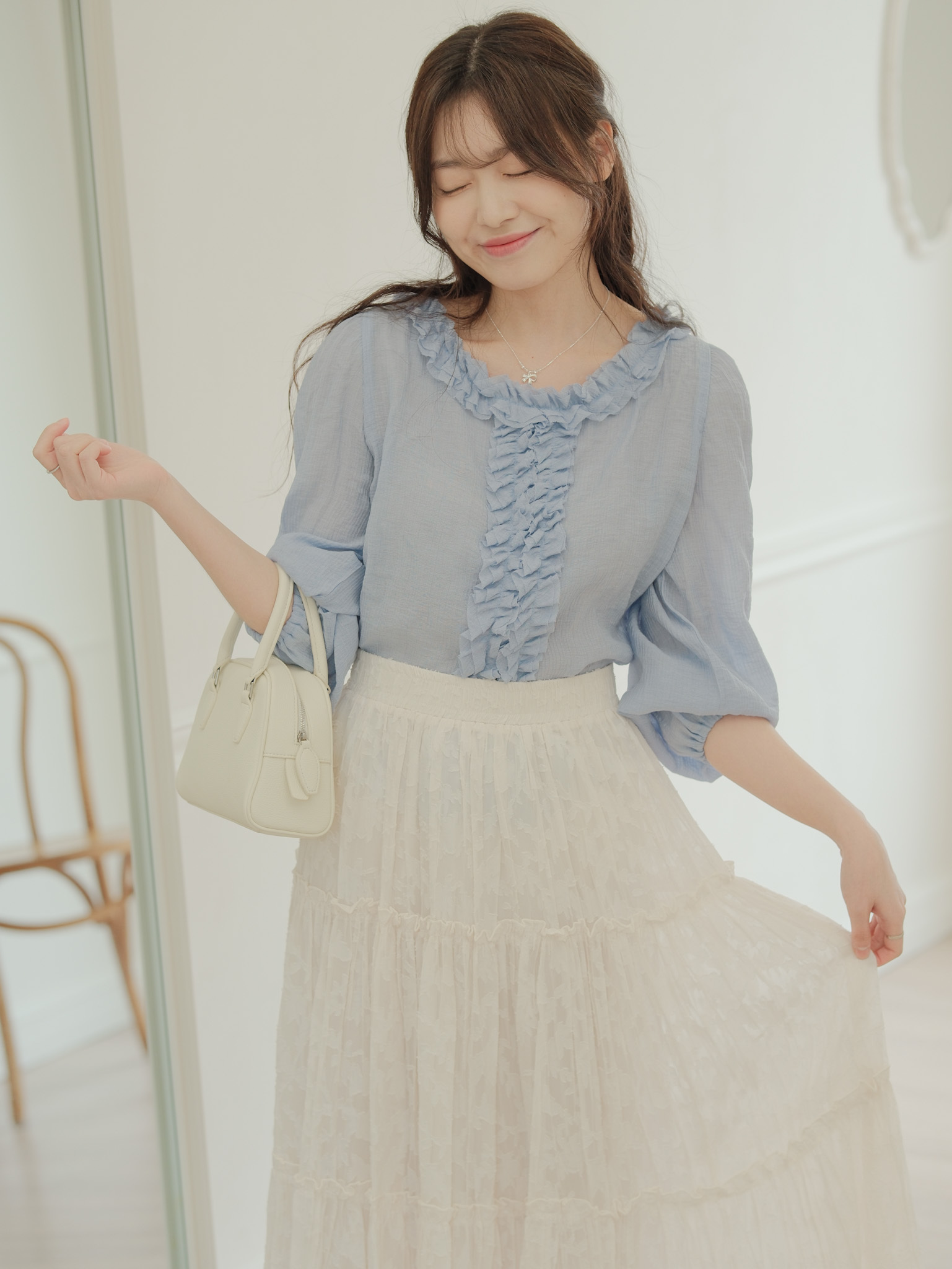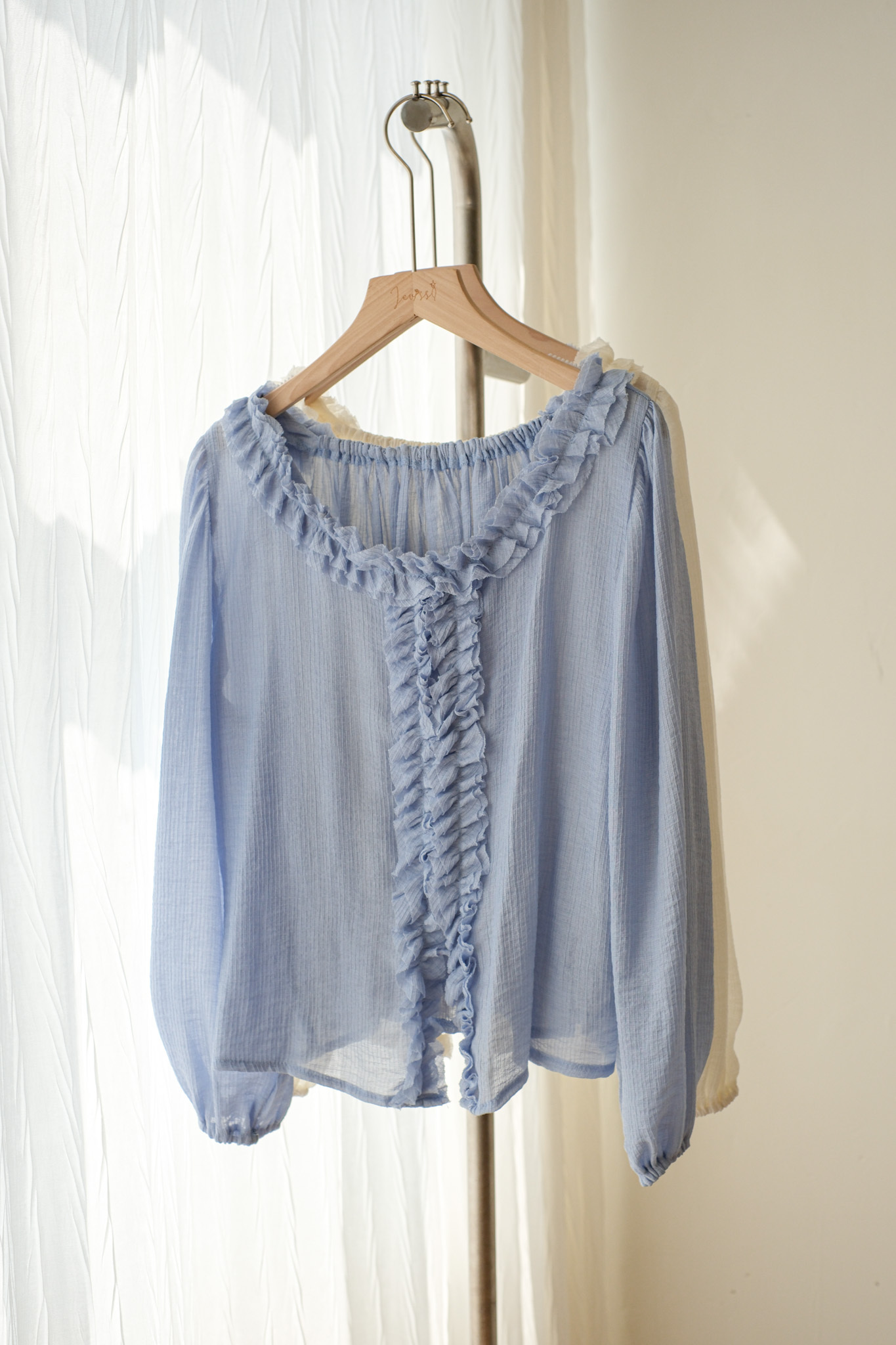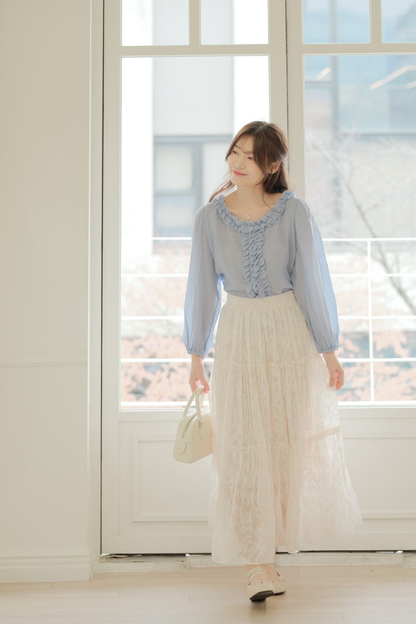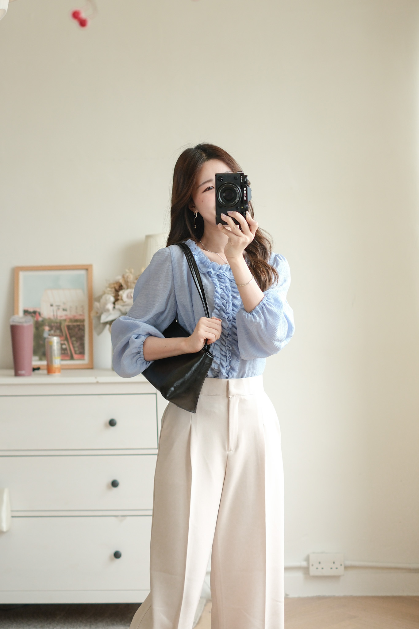 這款主要設計在於領口和衣服中間位置的木耳邊拼接