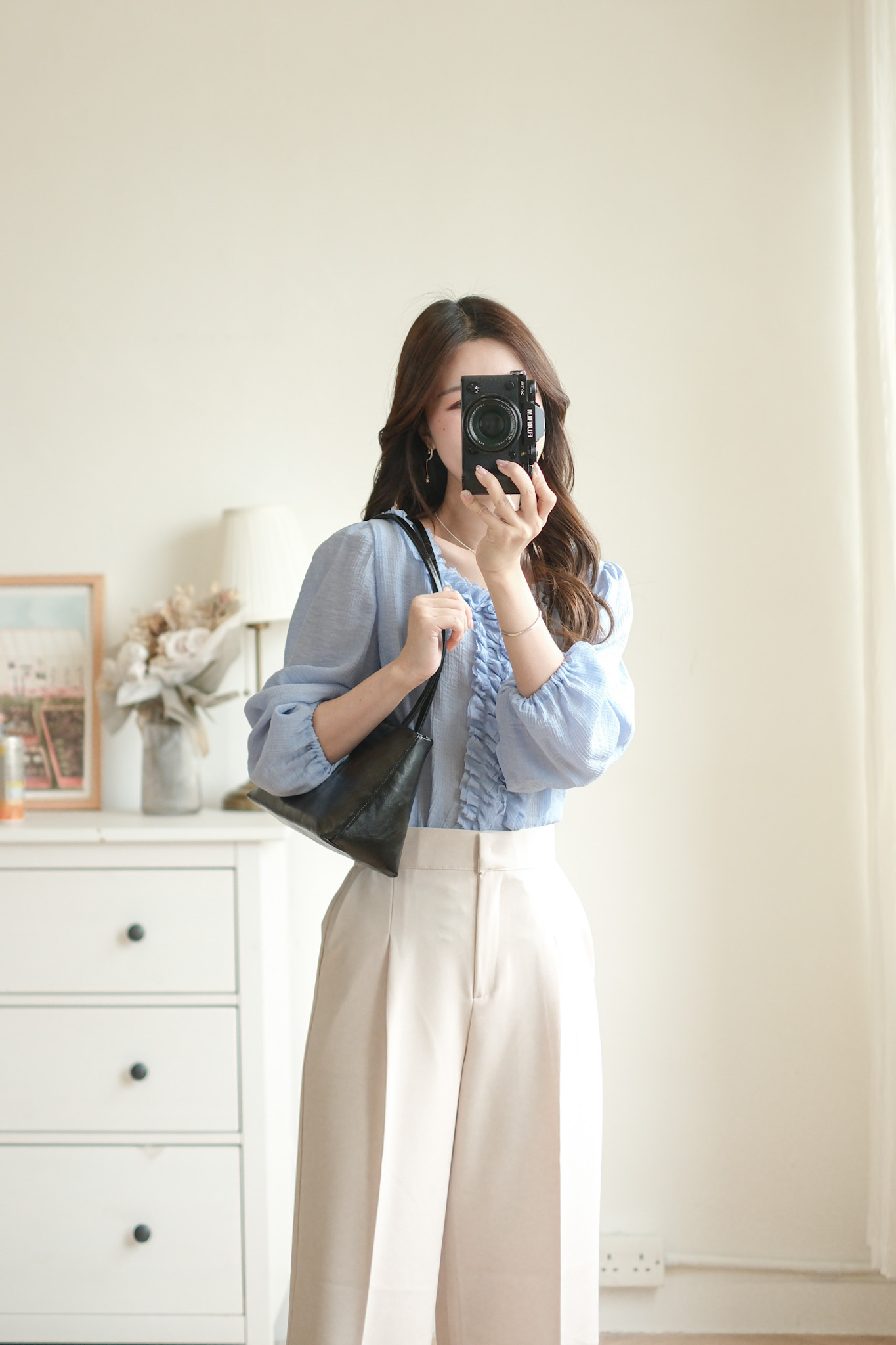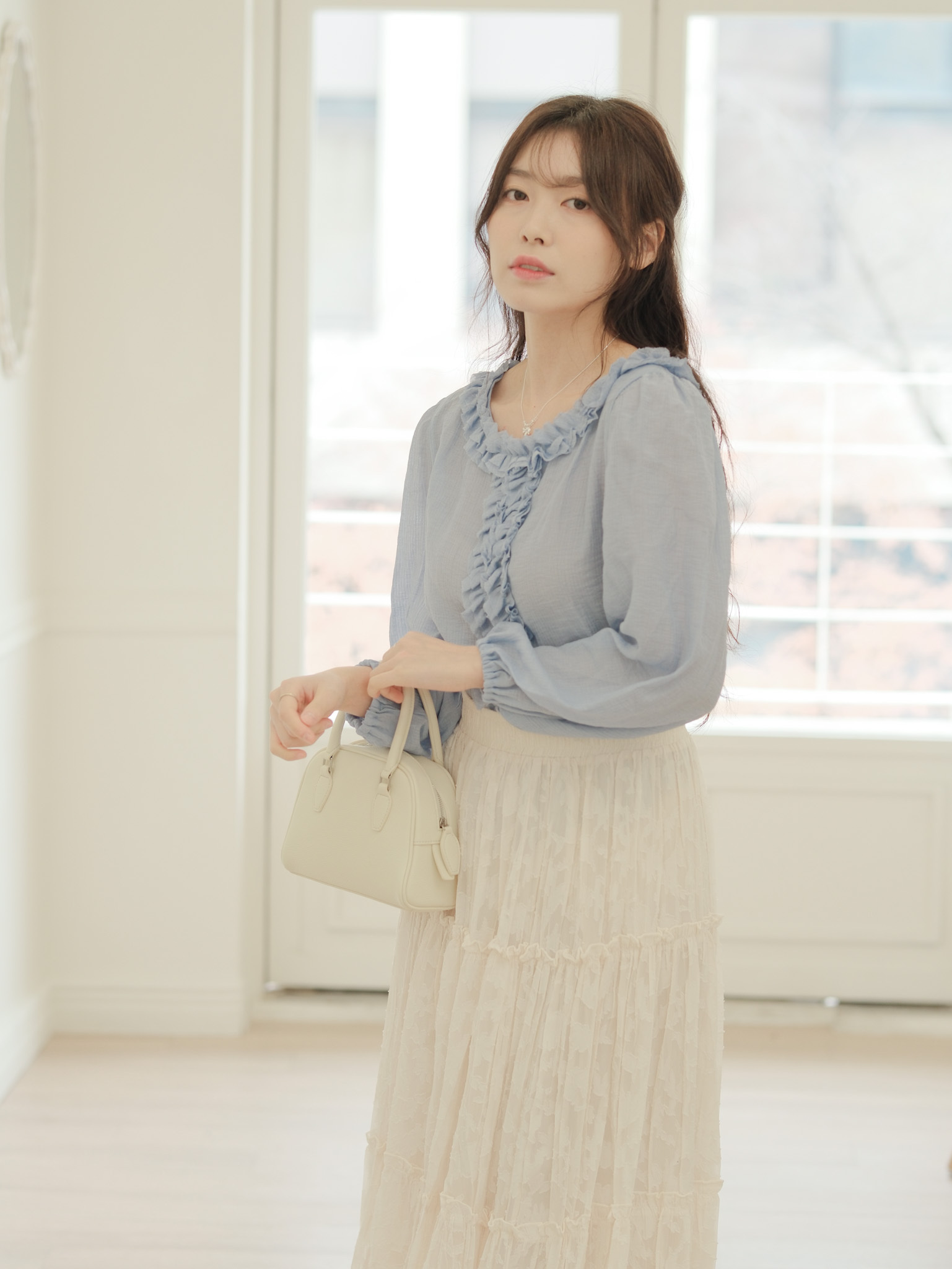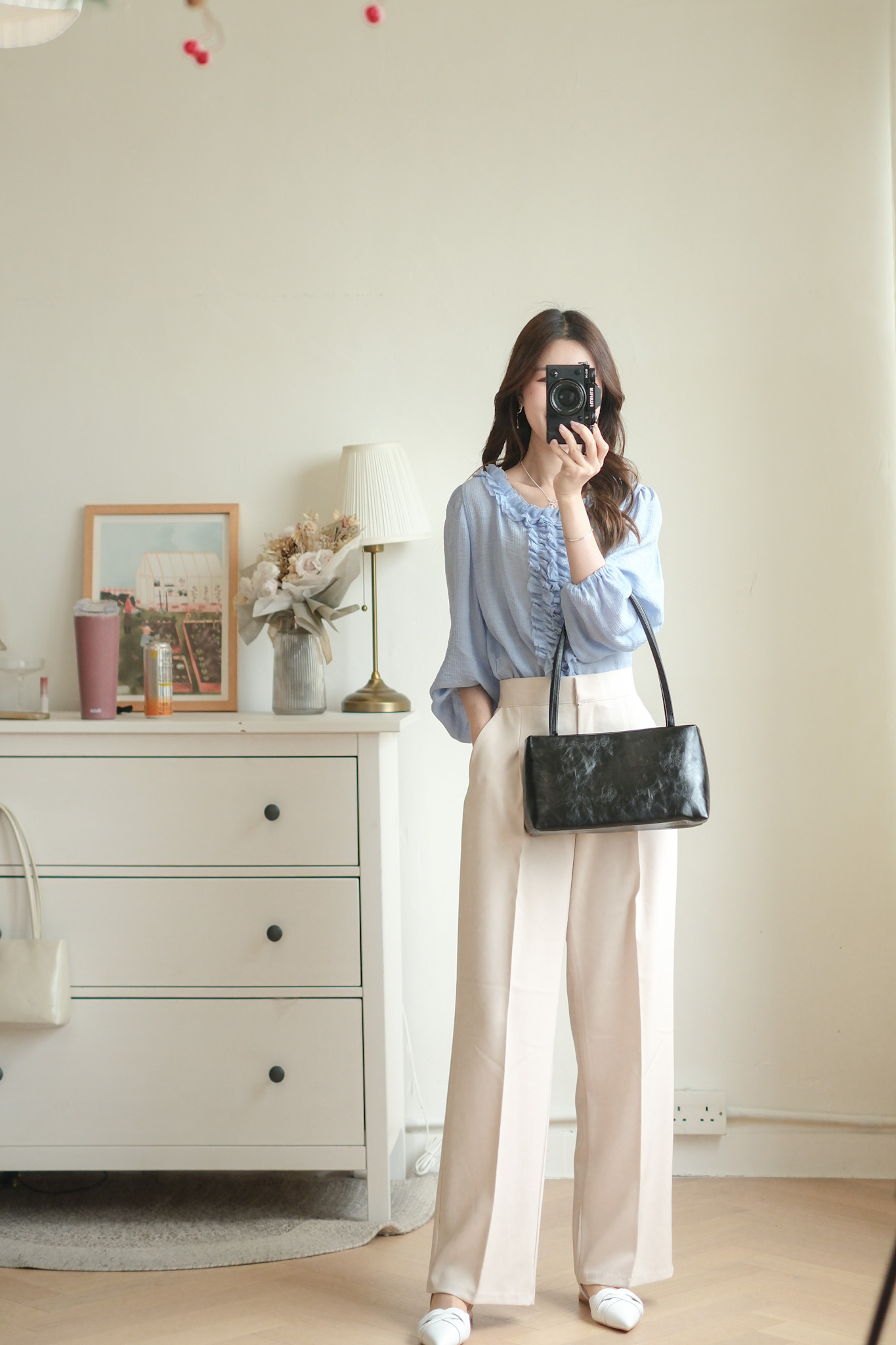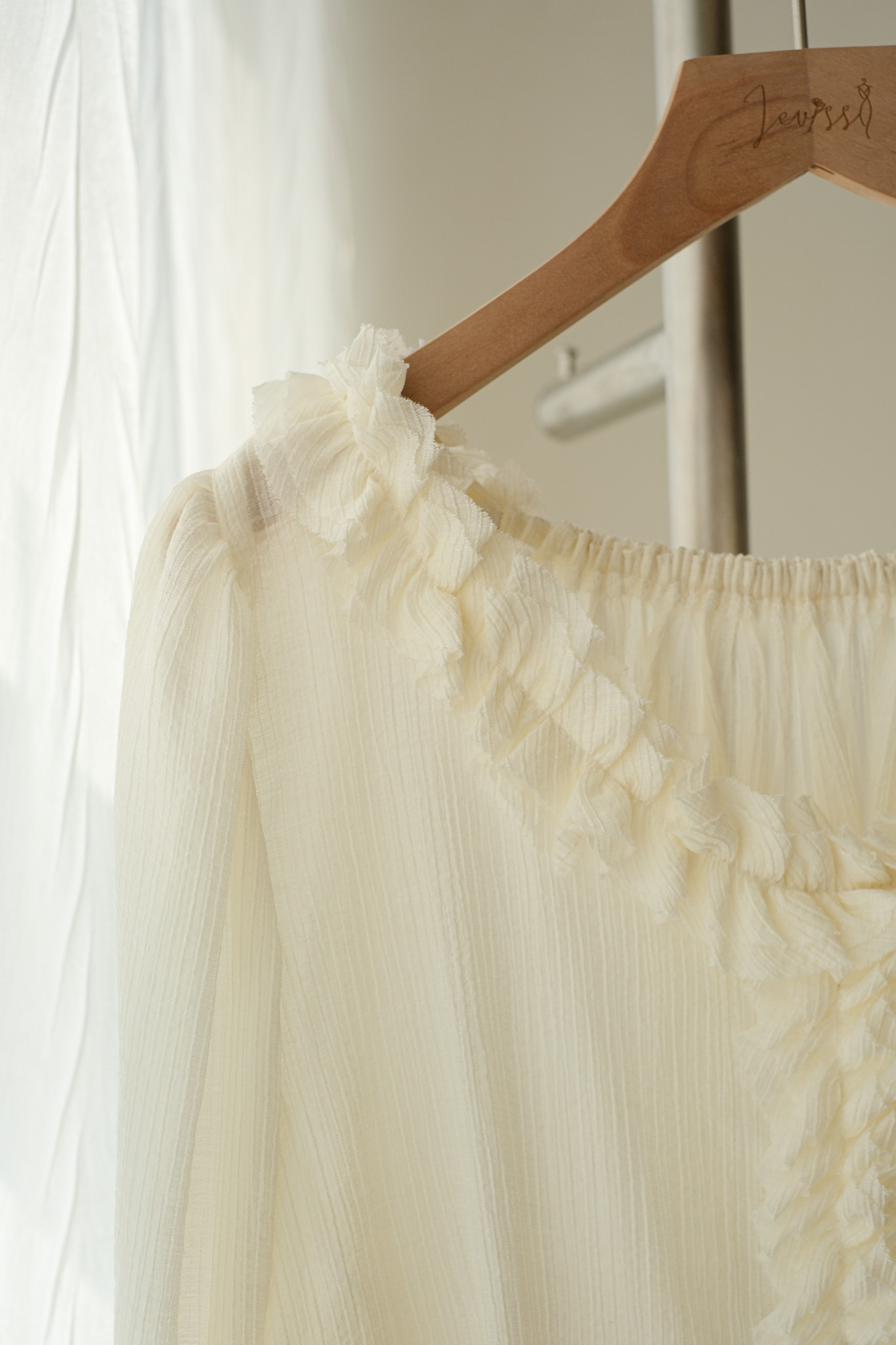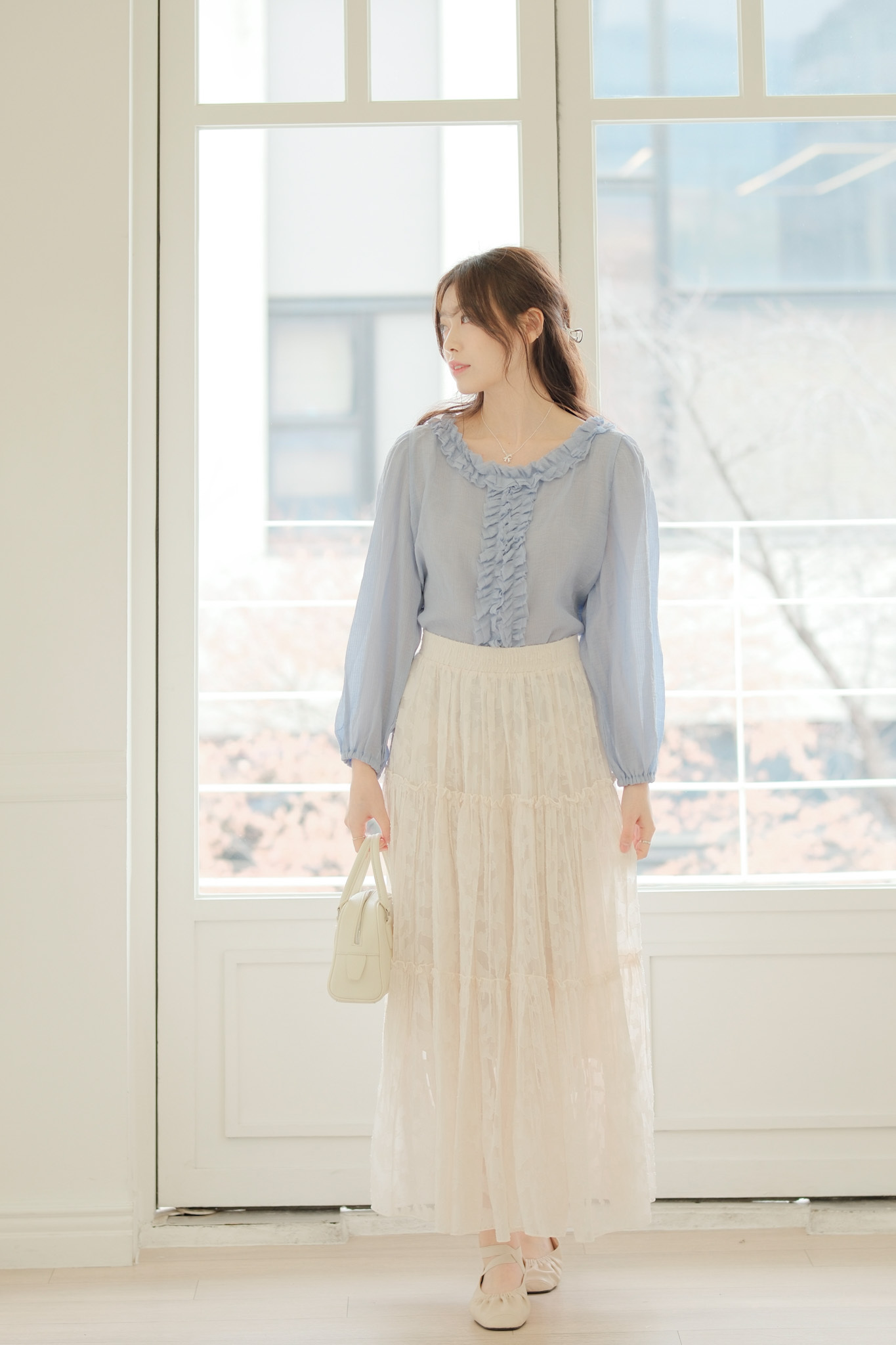 這款主要設計在於領口和衣服中間位置的木耳邊拼接
