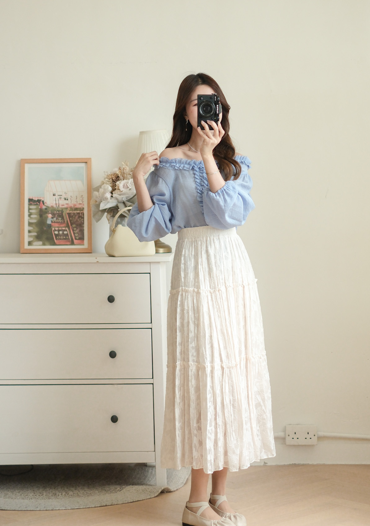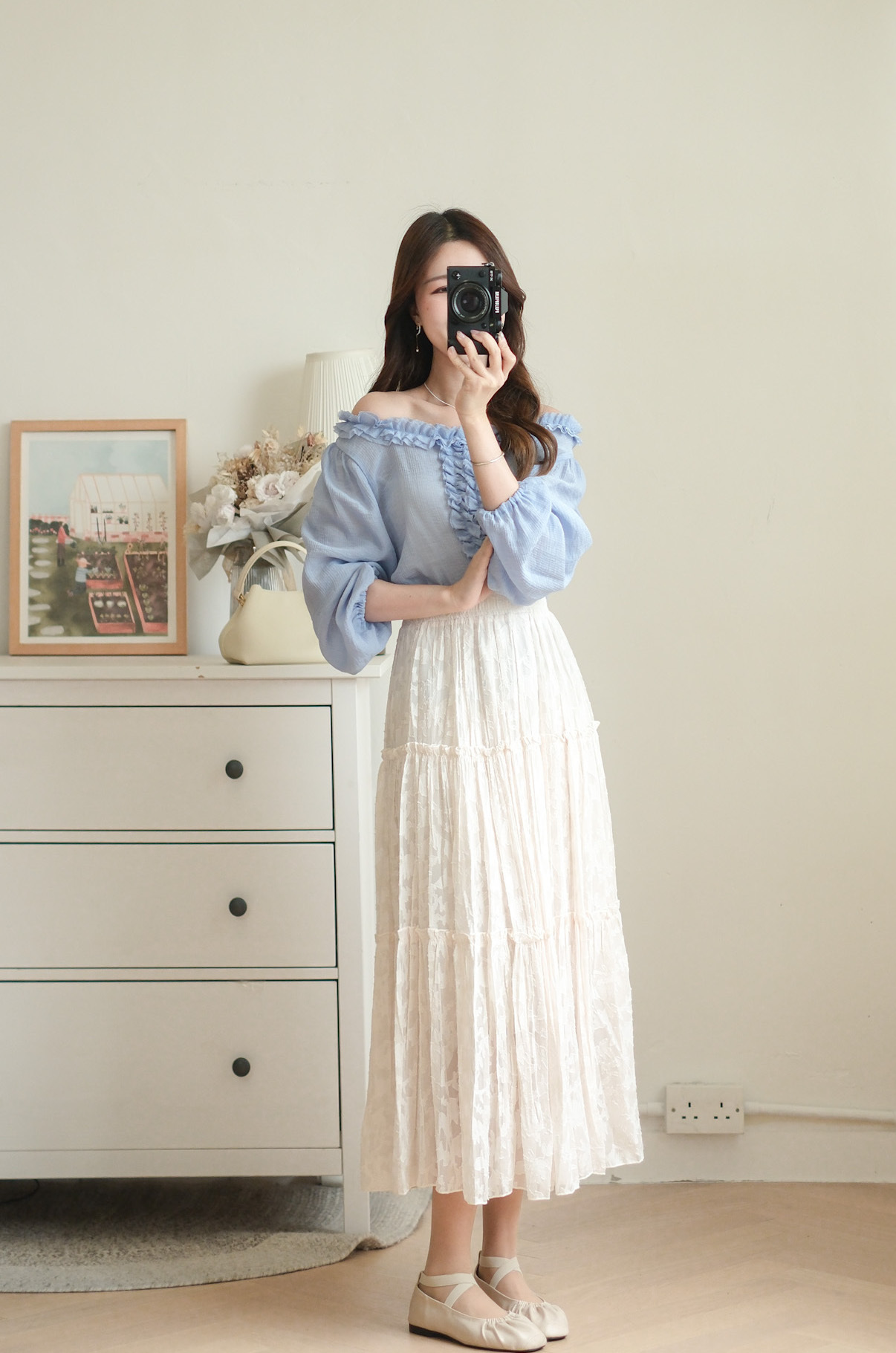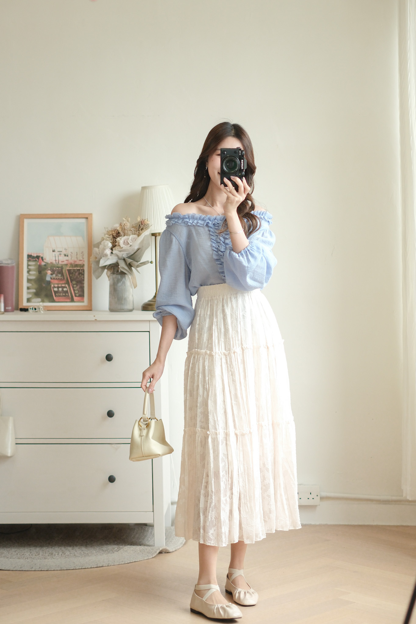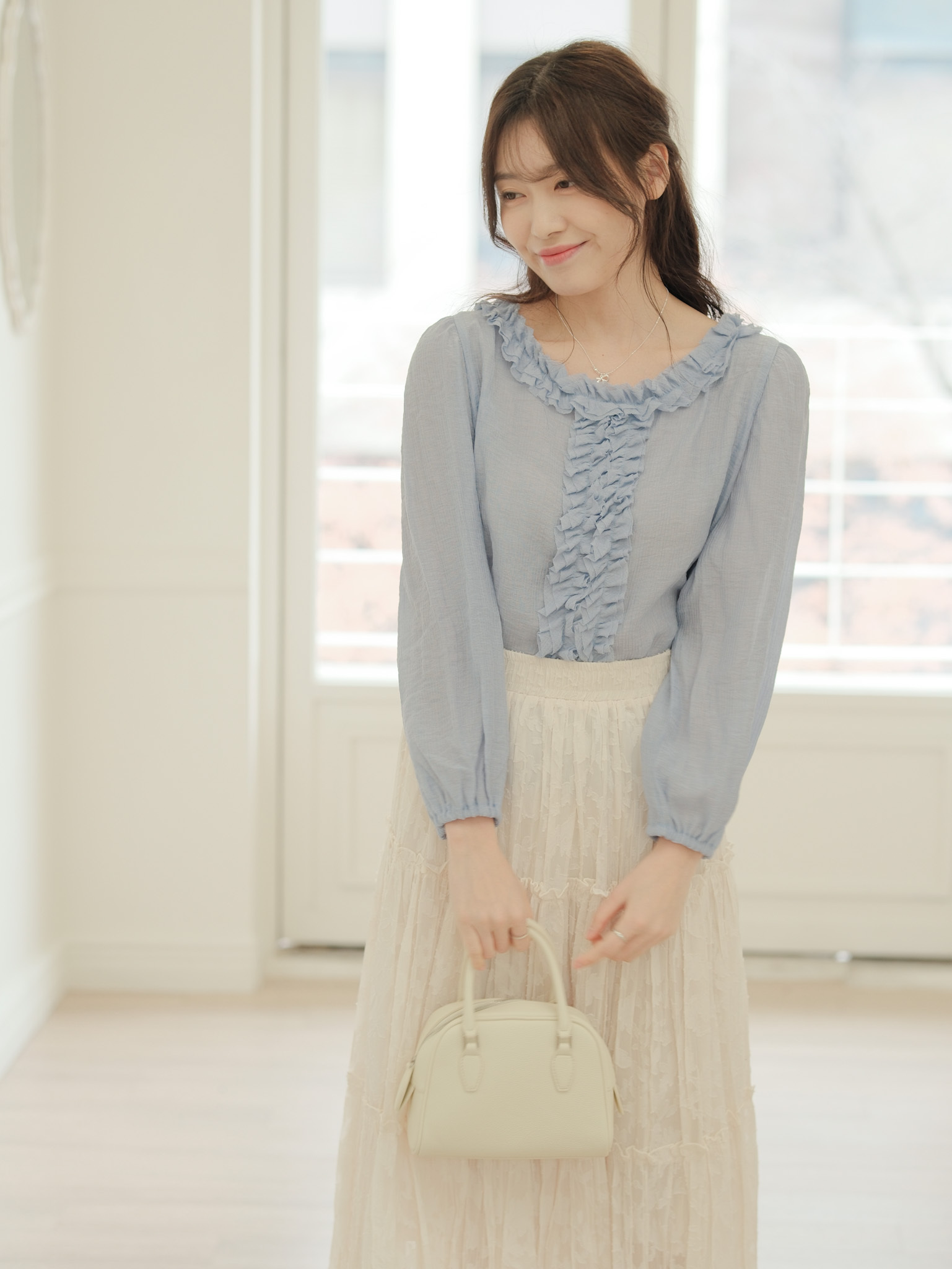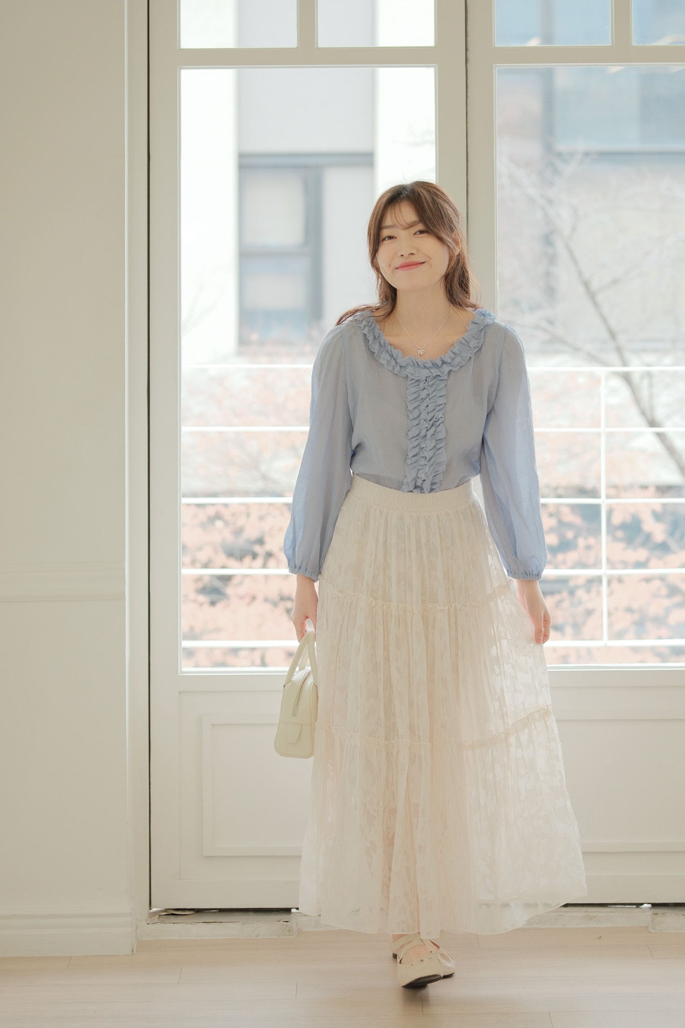 這款主要設計在於領口和衣服中間位置的木耳邊拼接