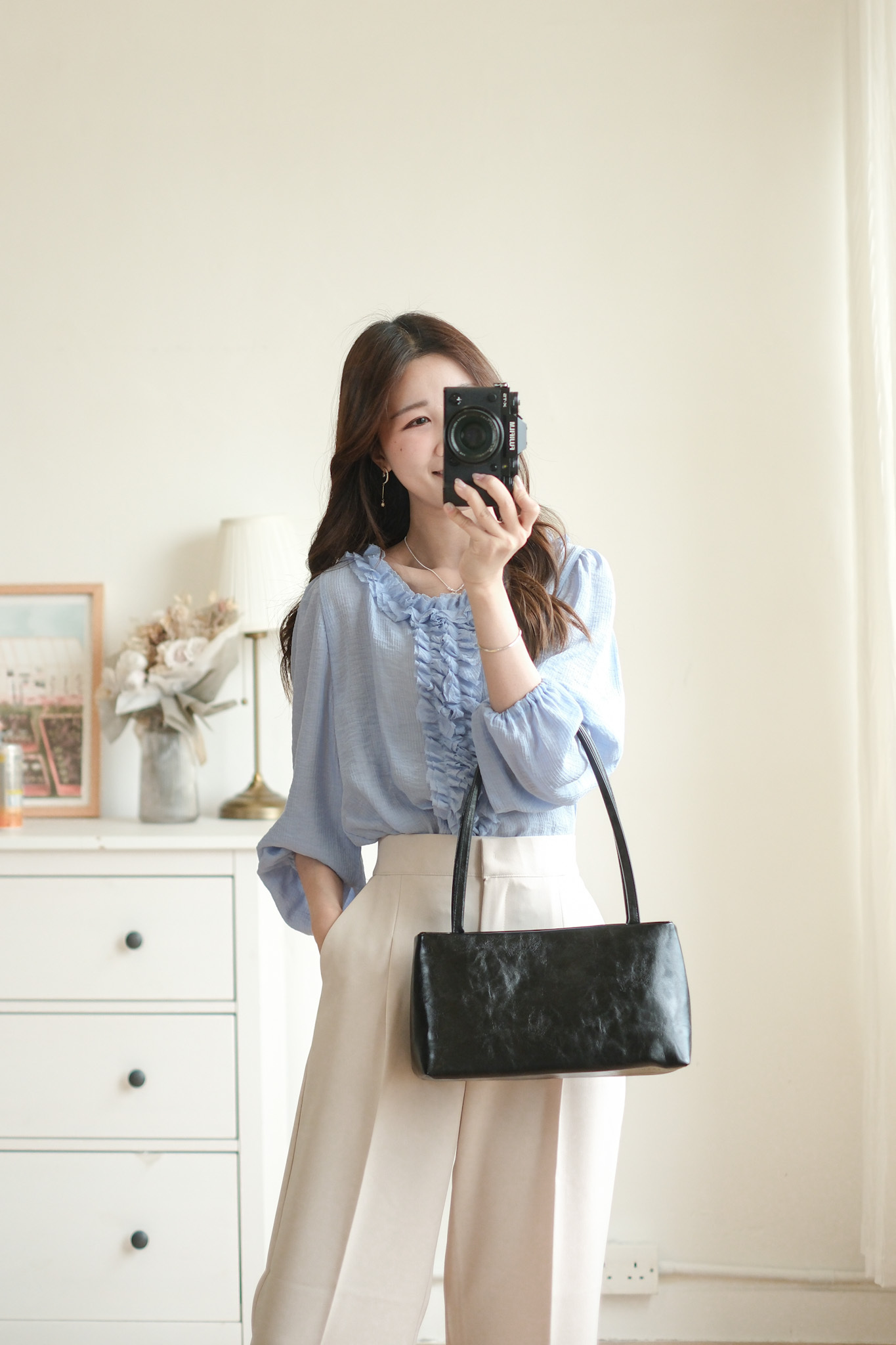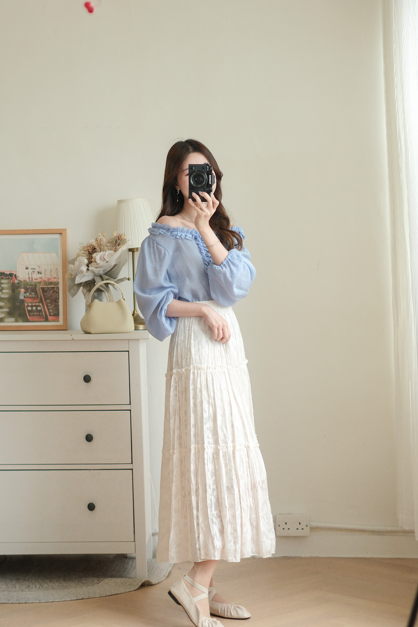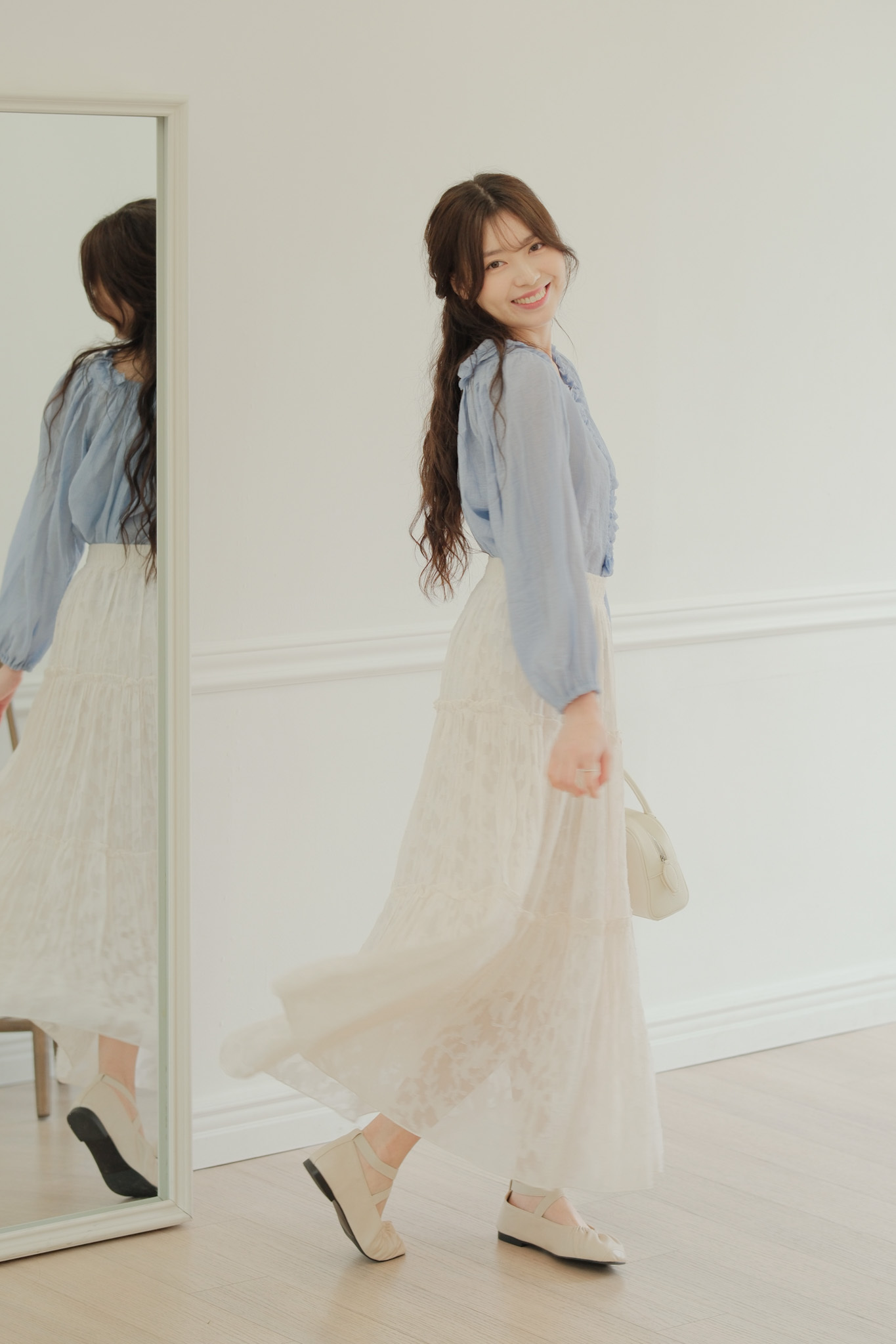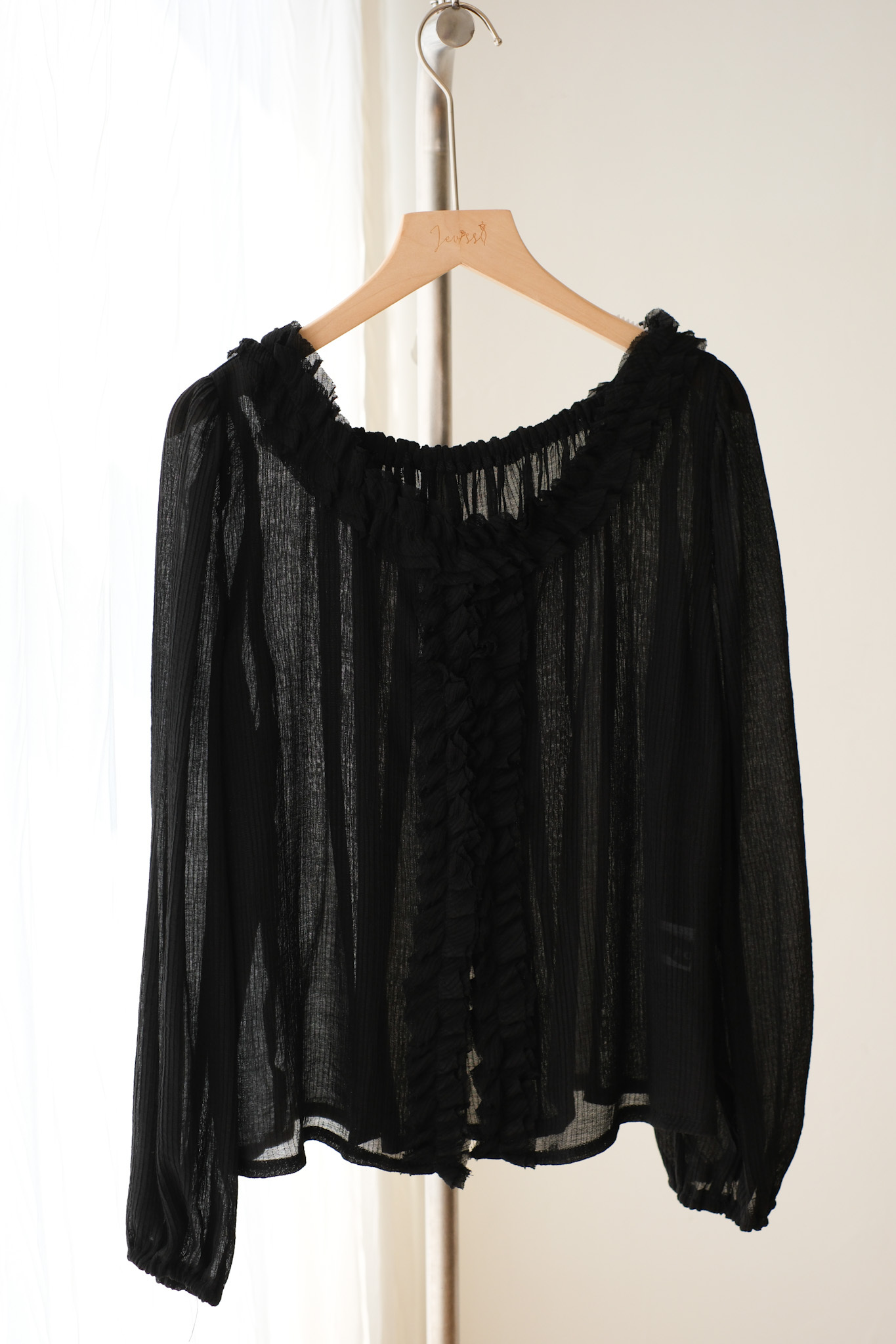 這款主要設計在於領口和衣服中間位置的木耳邊拼接
