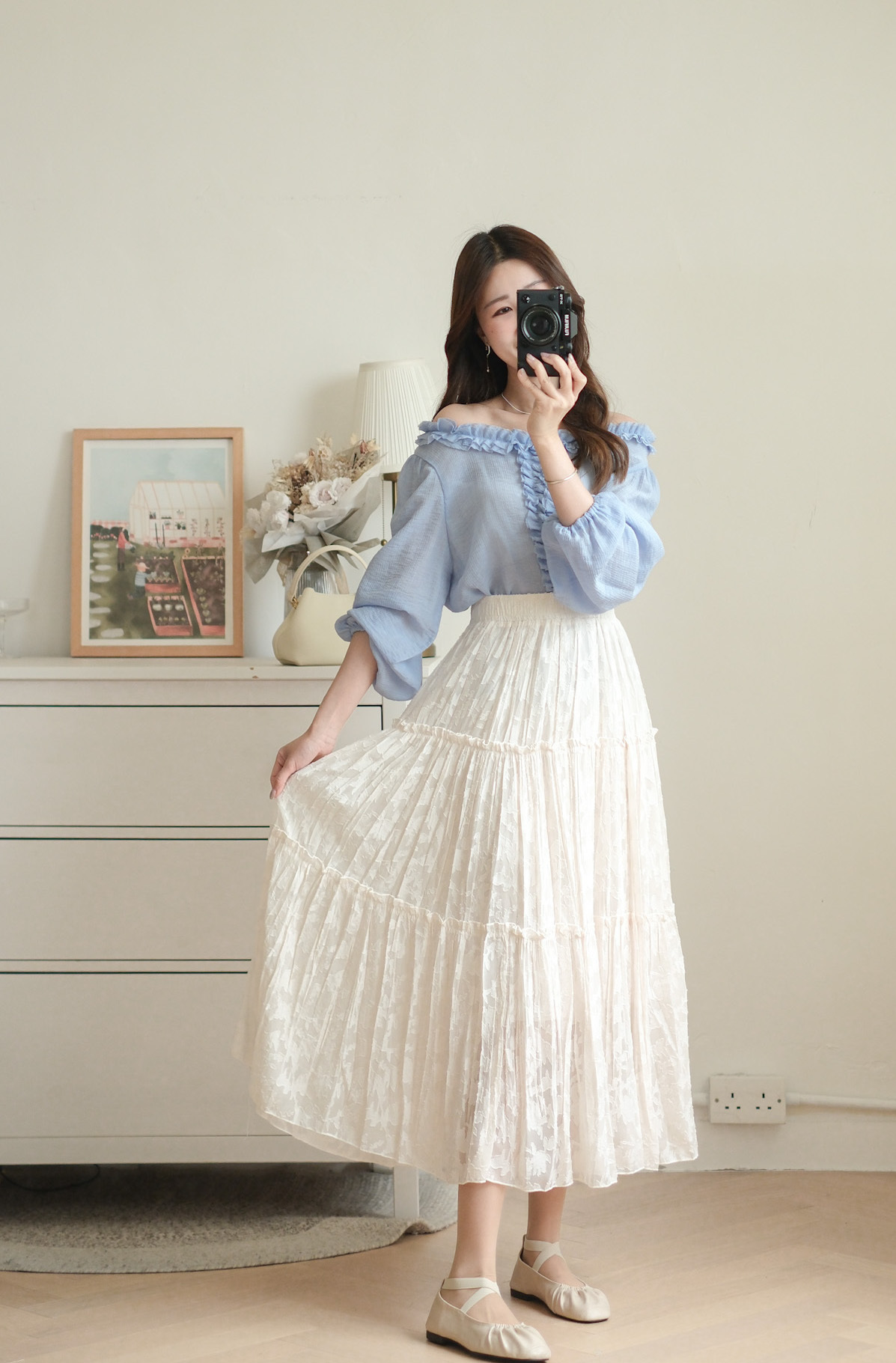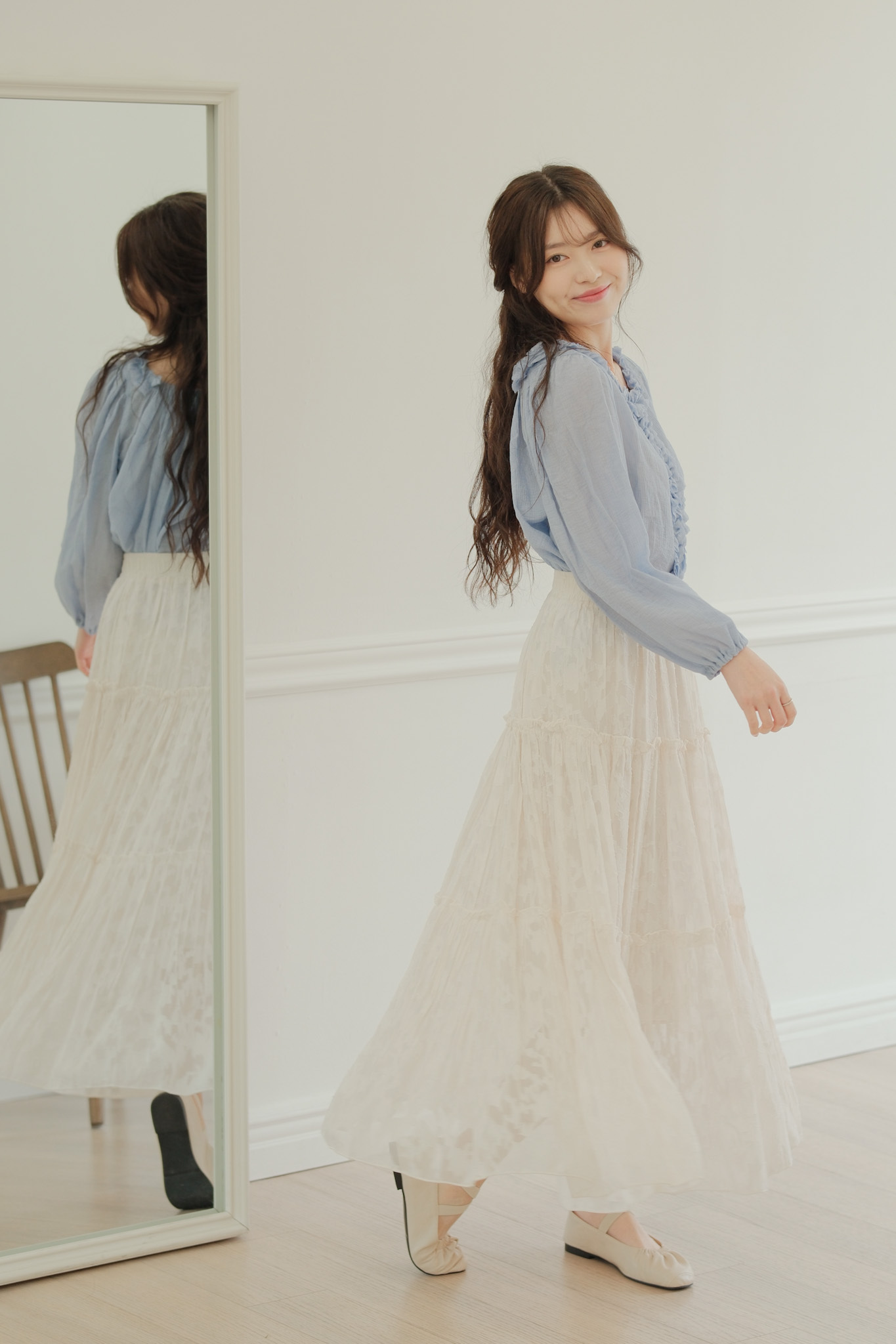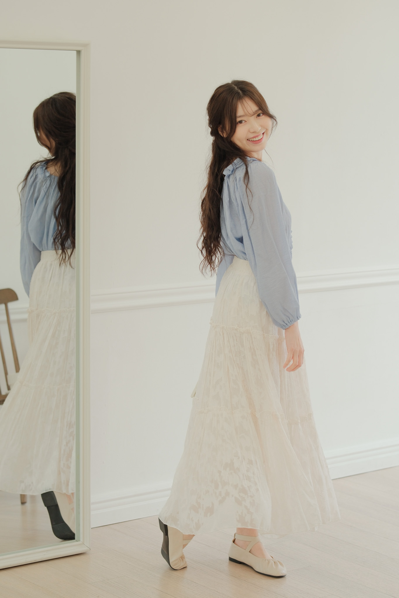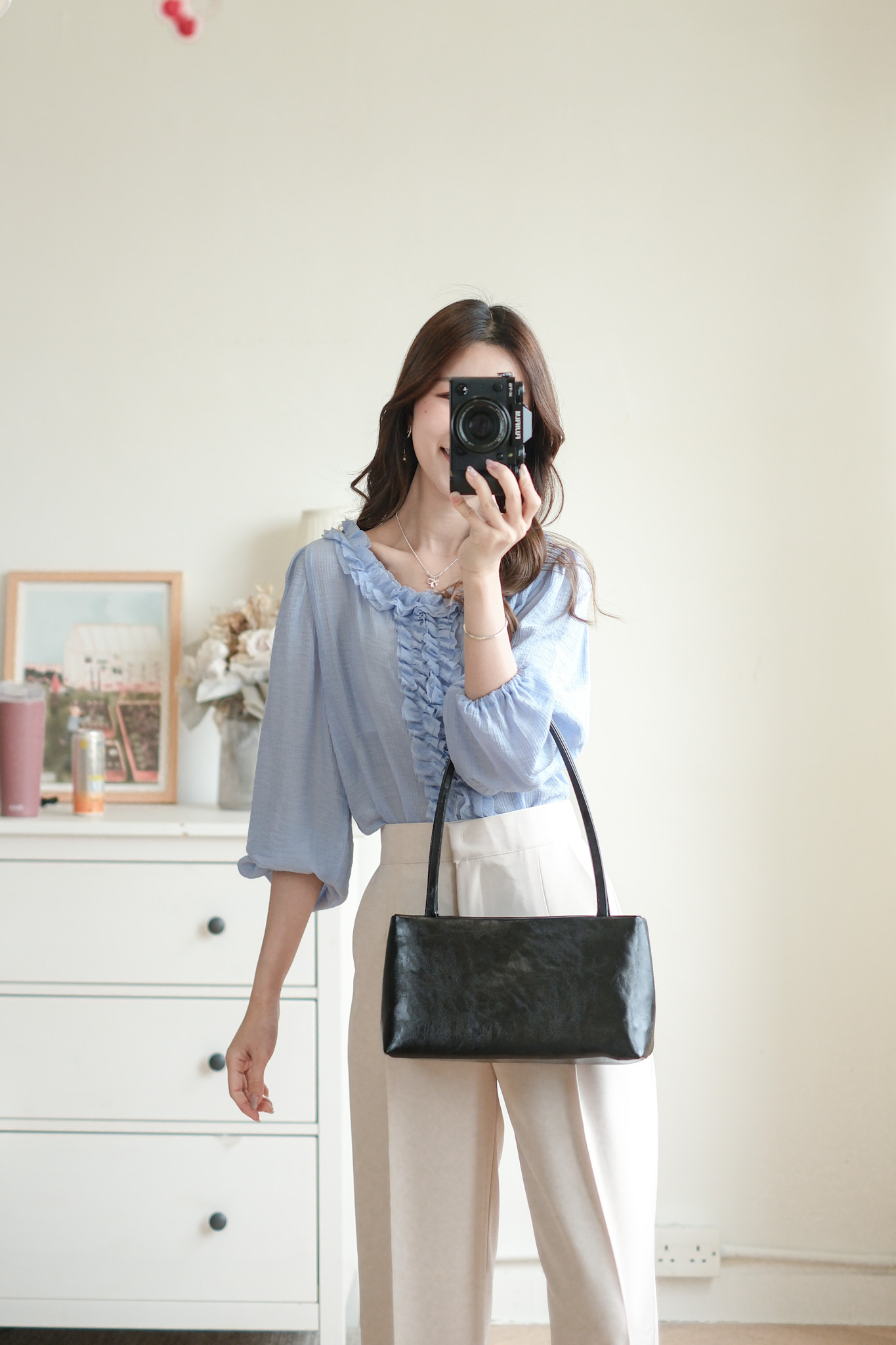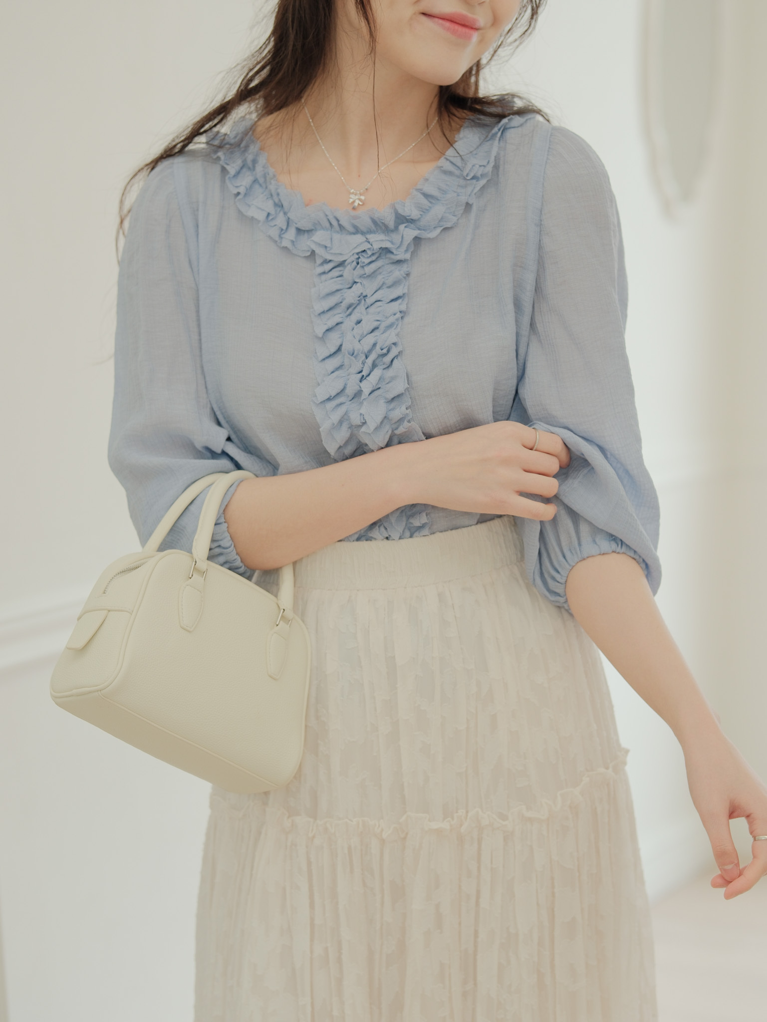 這款主要設計在於領口和衣服中間位置的木耳邊拼接