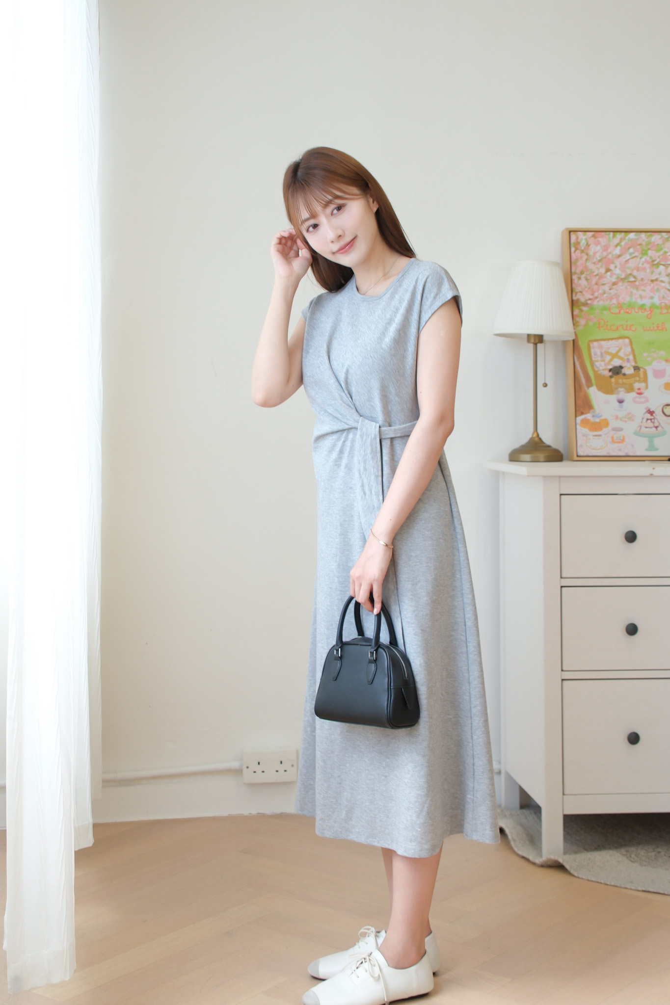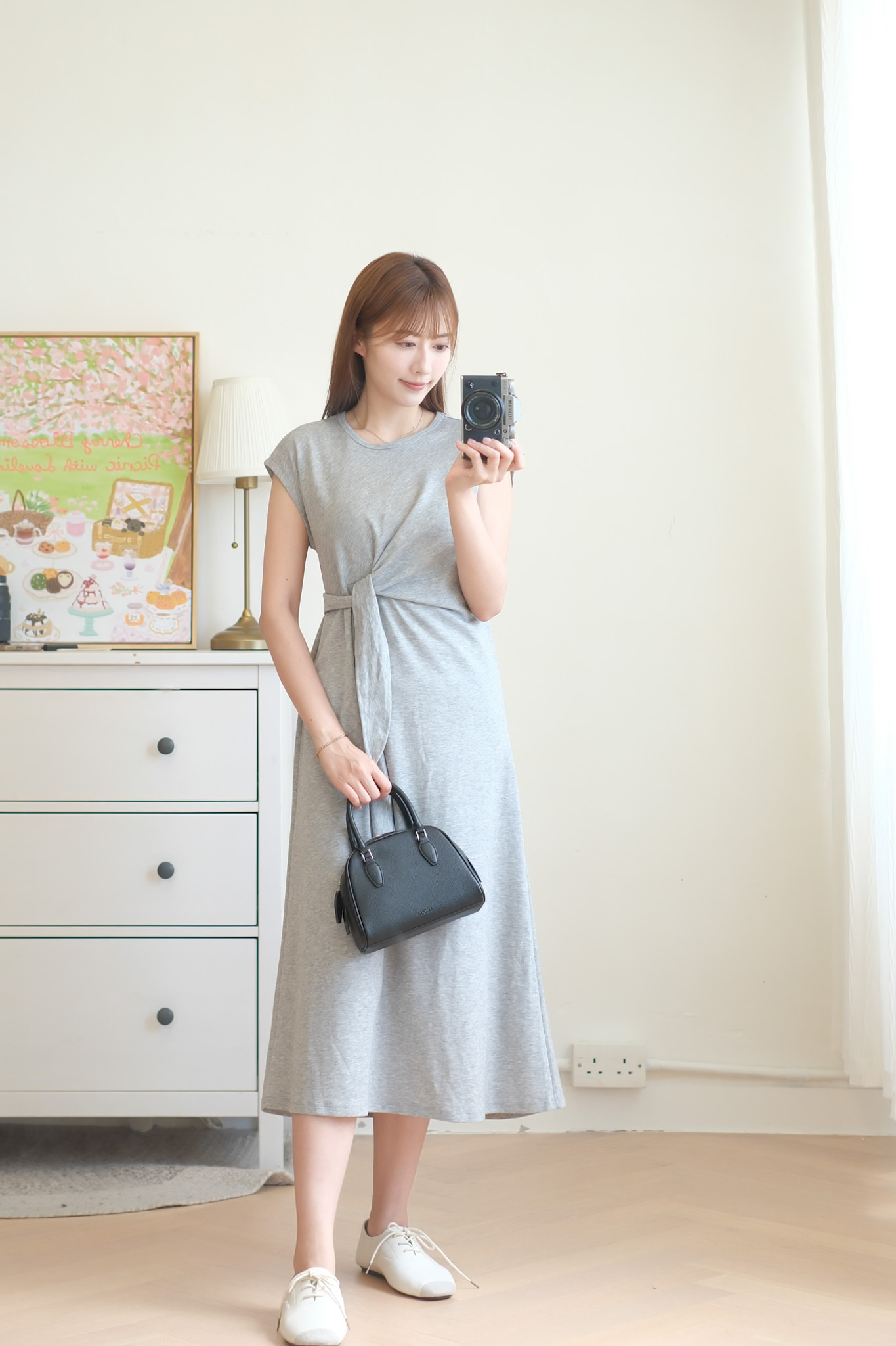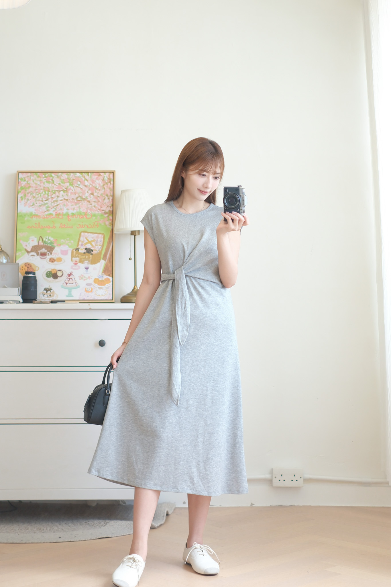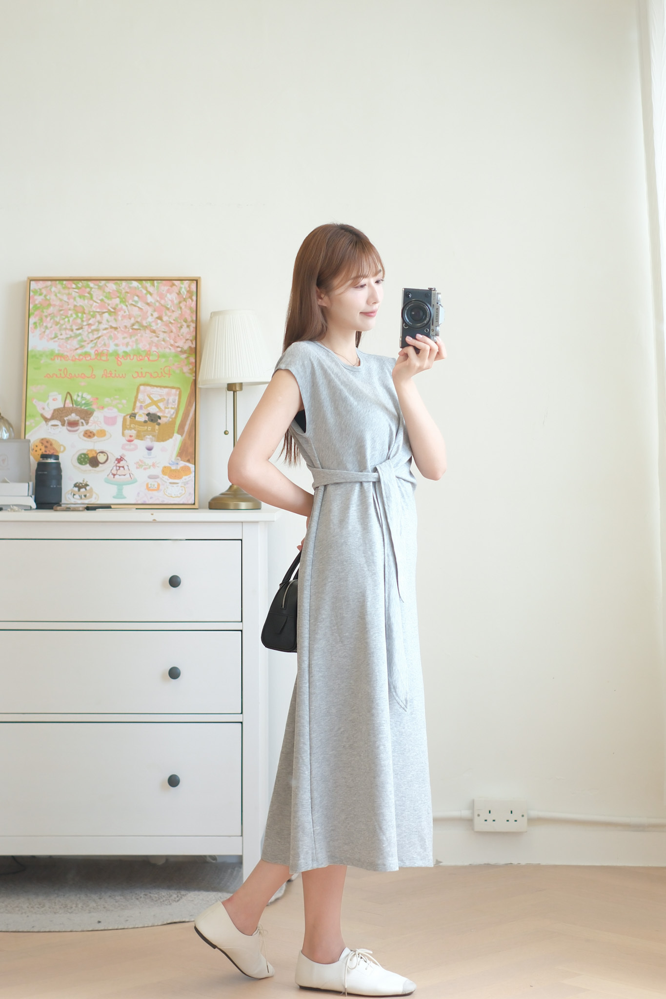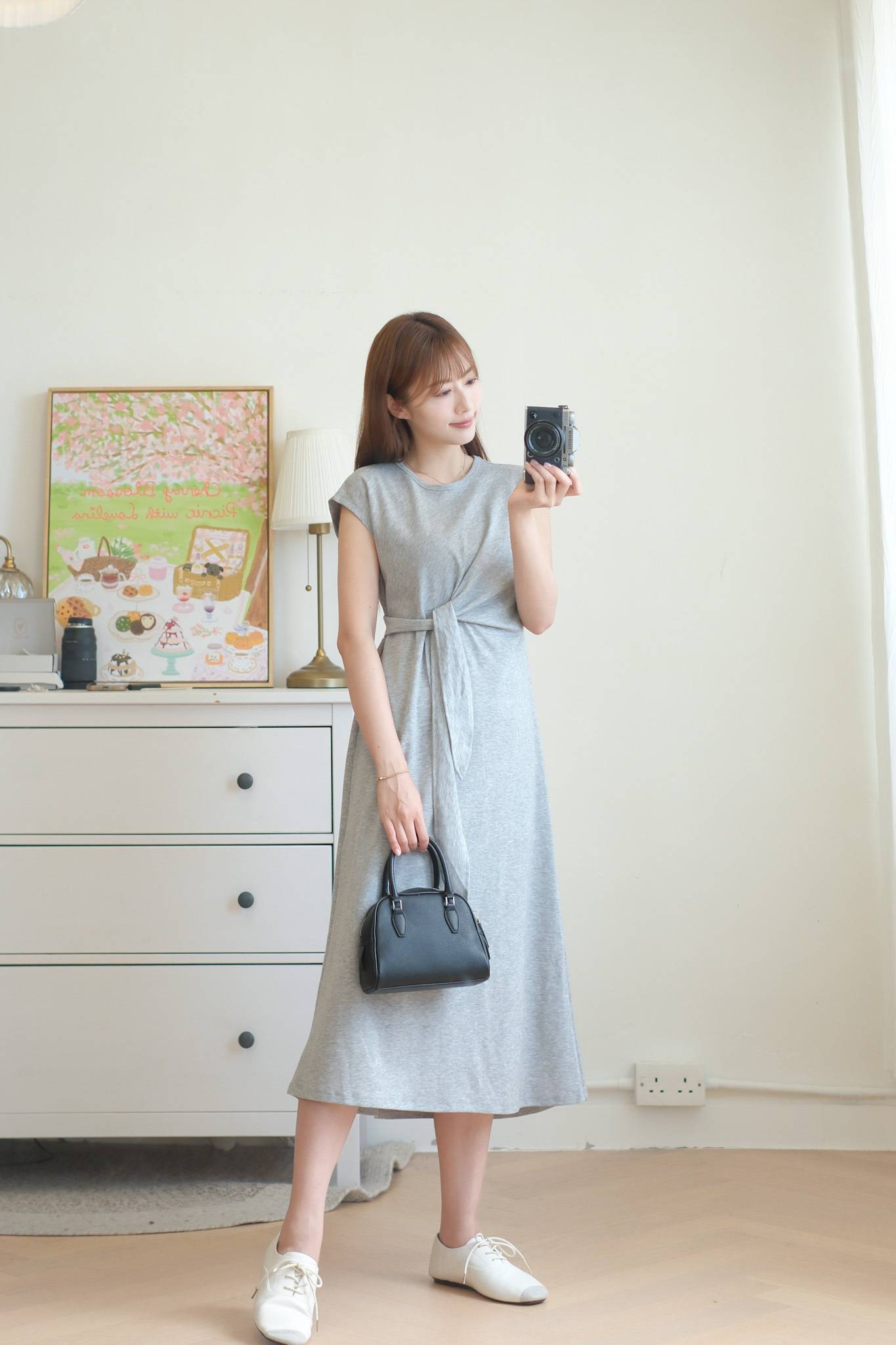 腰綁結隨性休閒連身裙 (灰/黑) OPS196