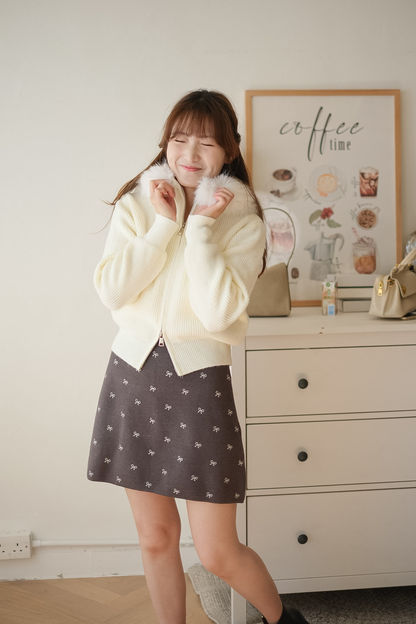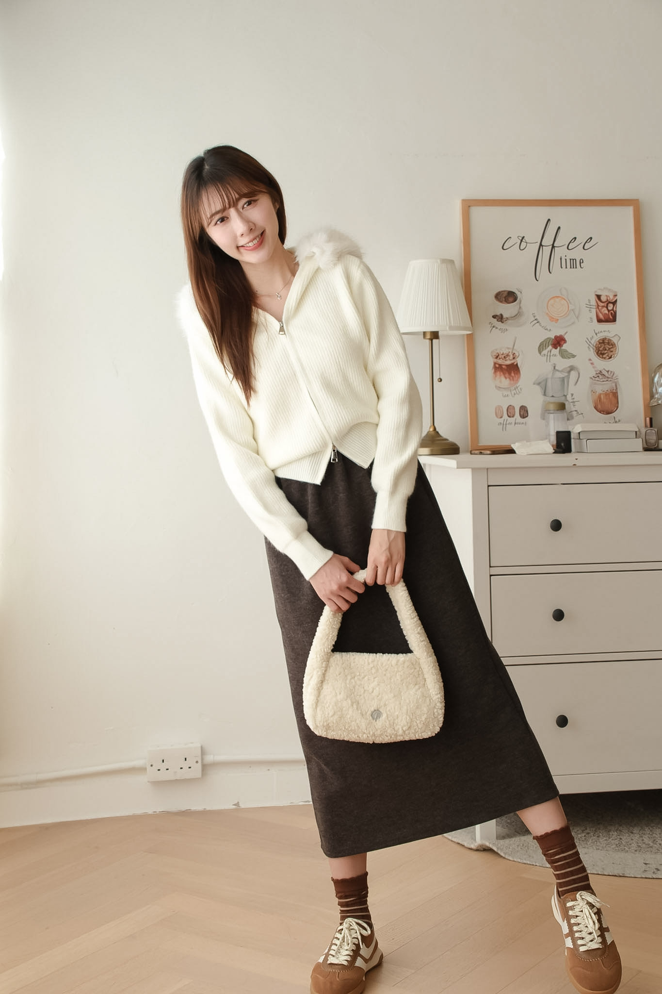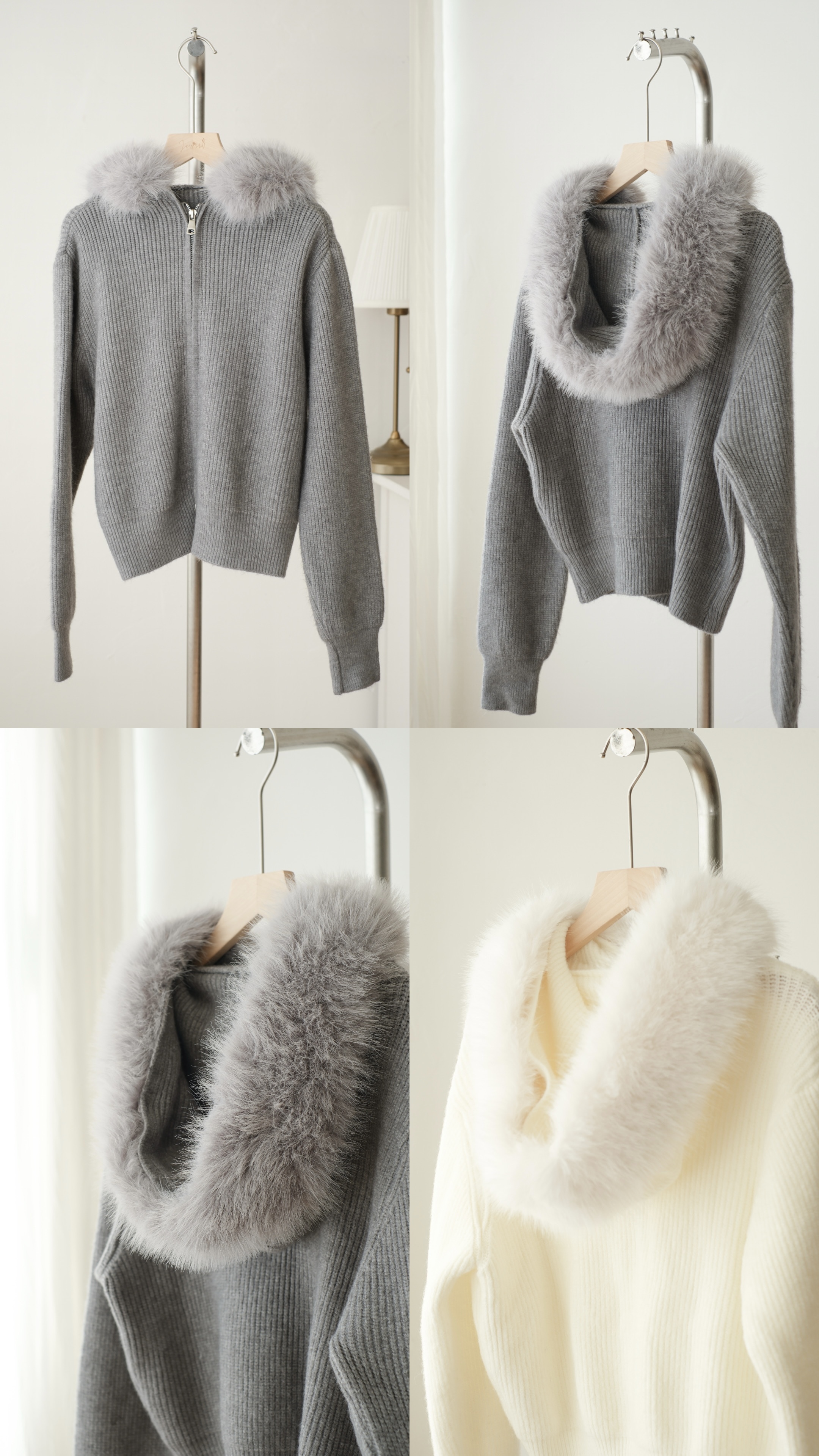超浪漫毛毛針織拉鏈外套 (米白/淺灰) Top607