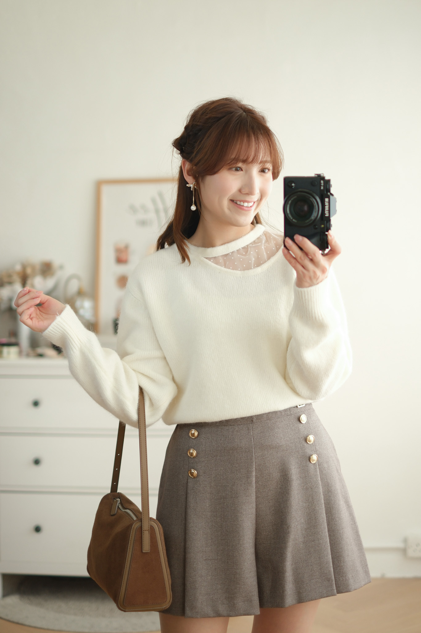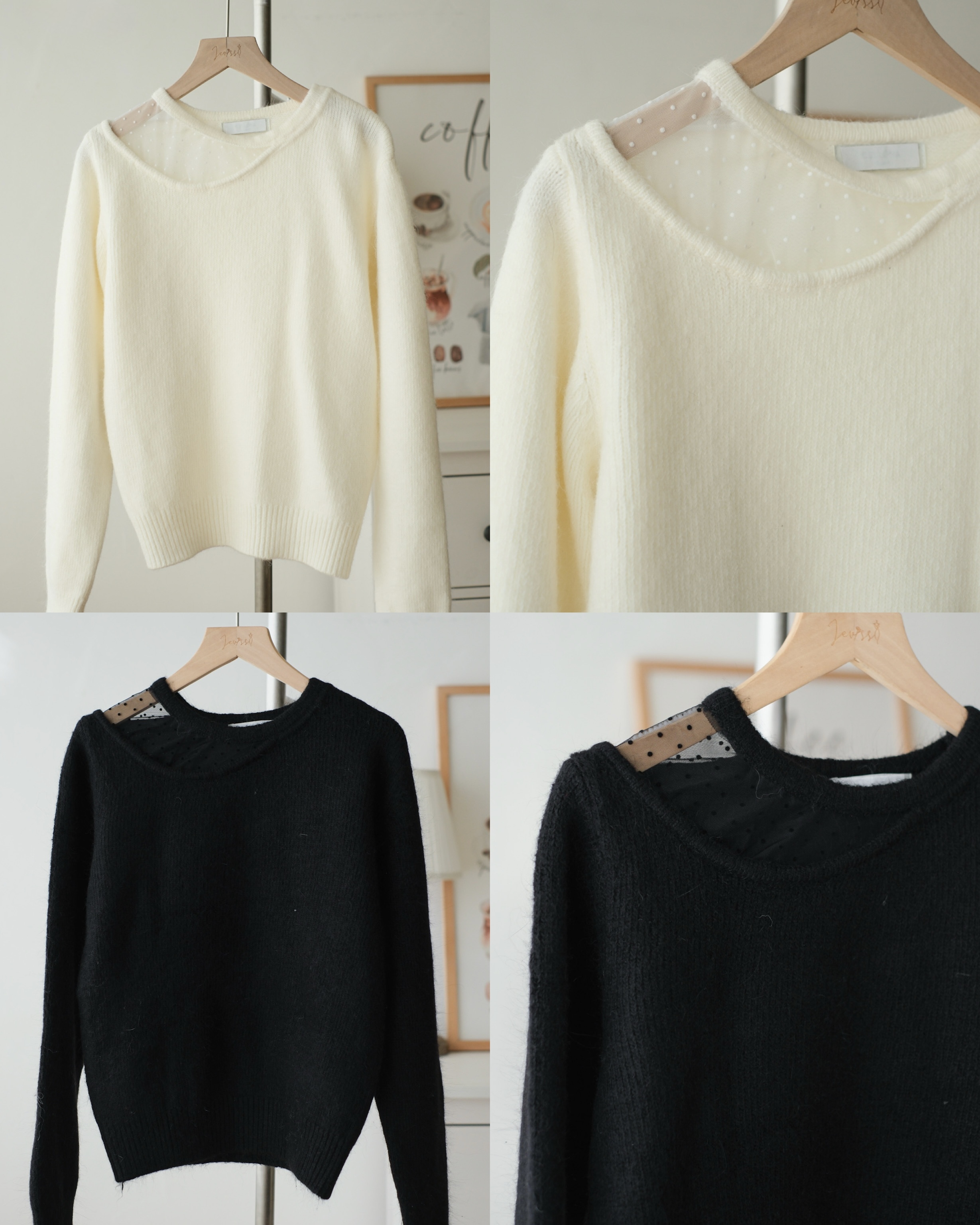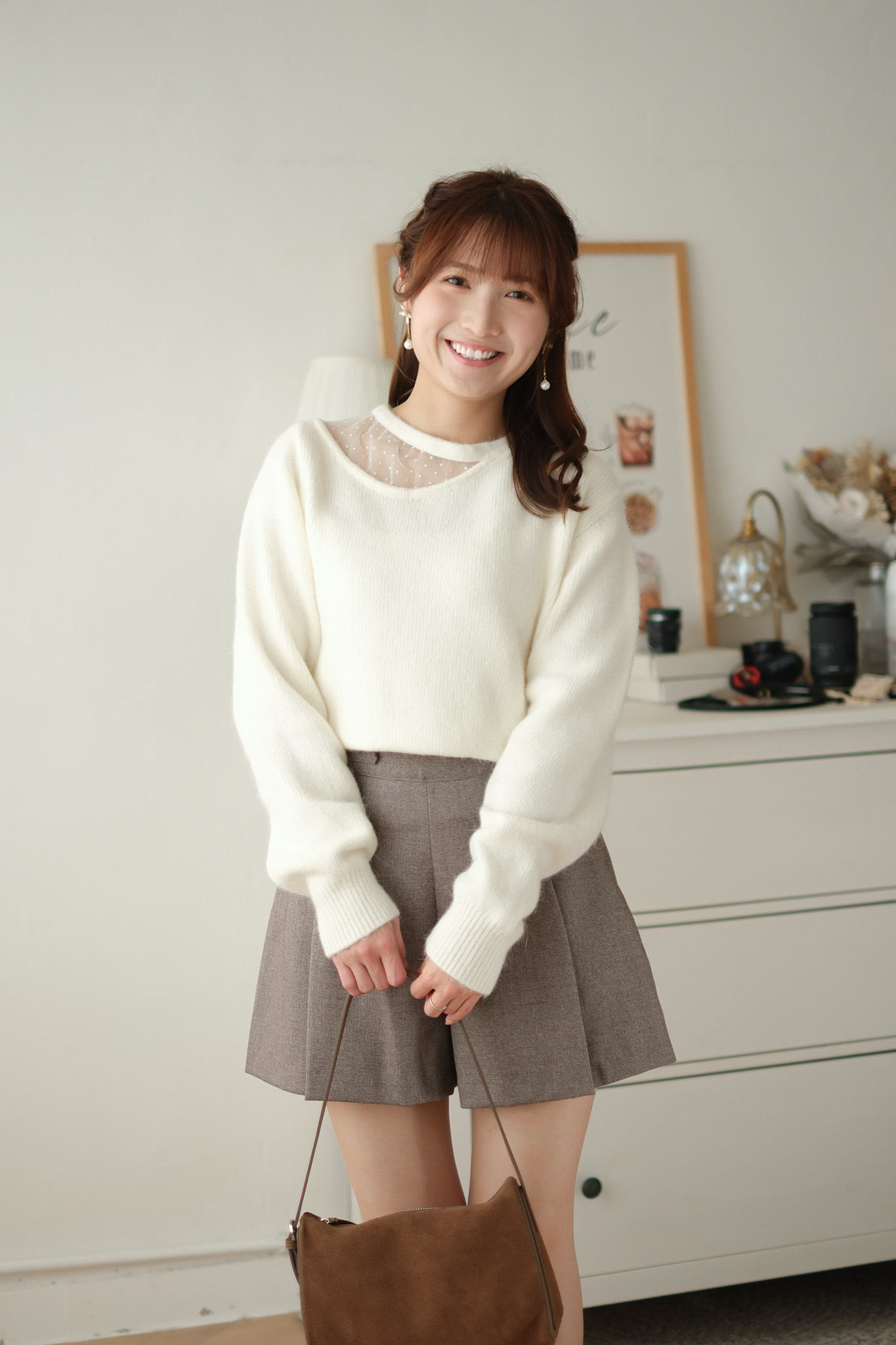 軟紗拼接圓領羊毛毛衣 (米白/黑) TOP612