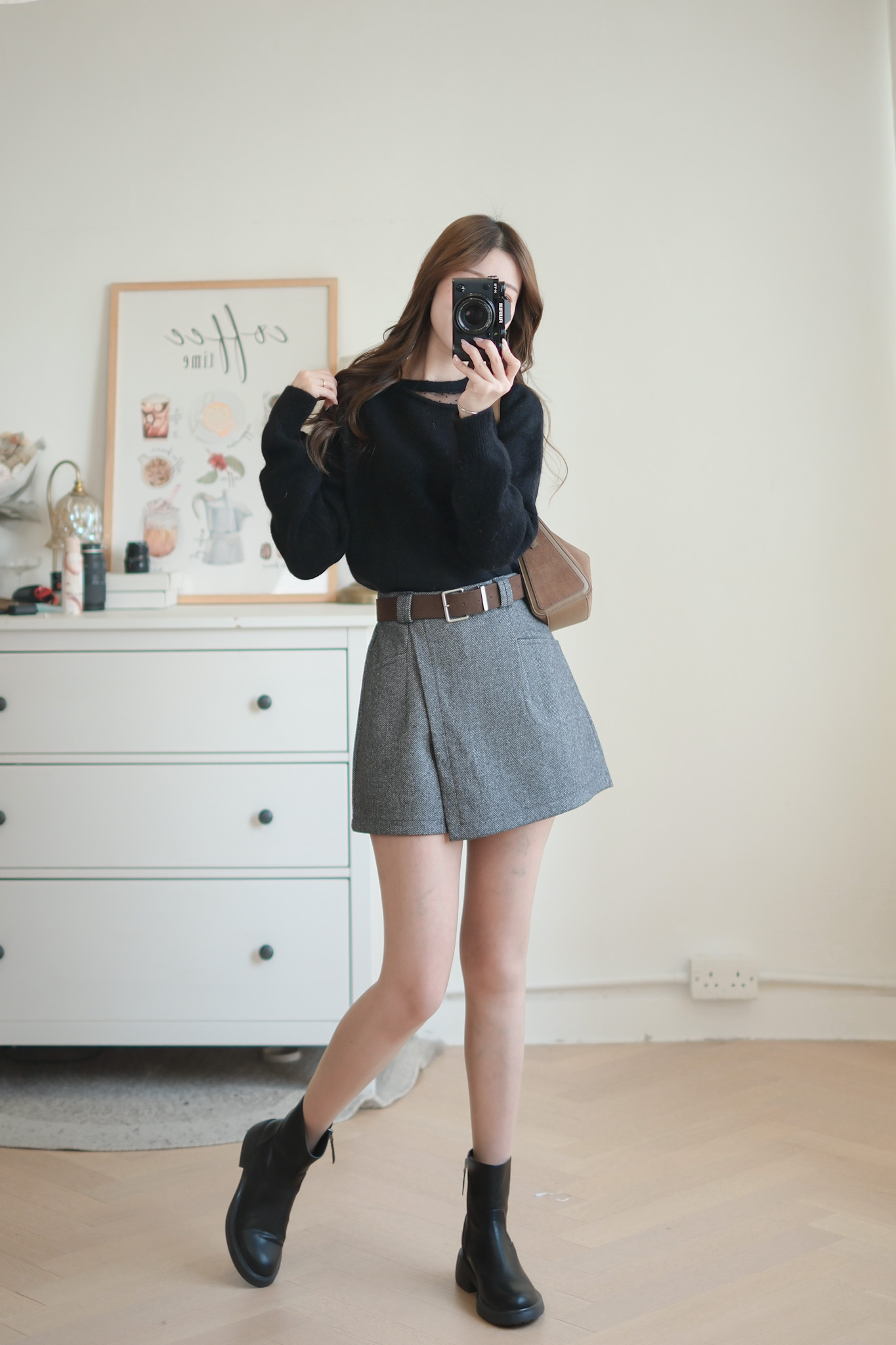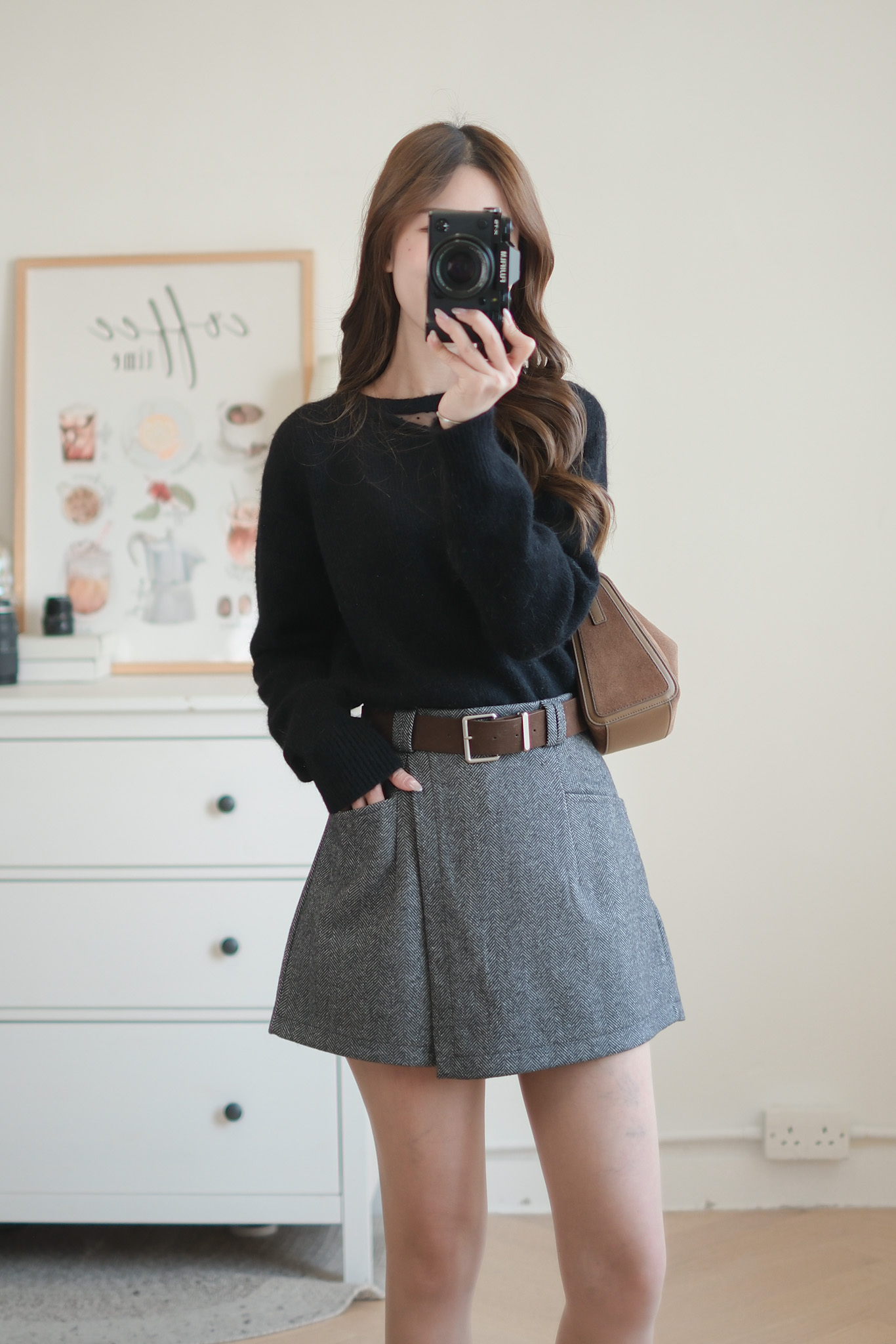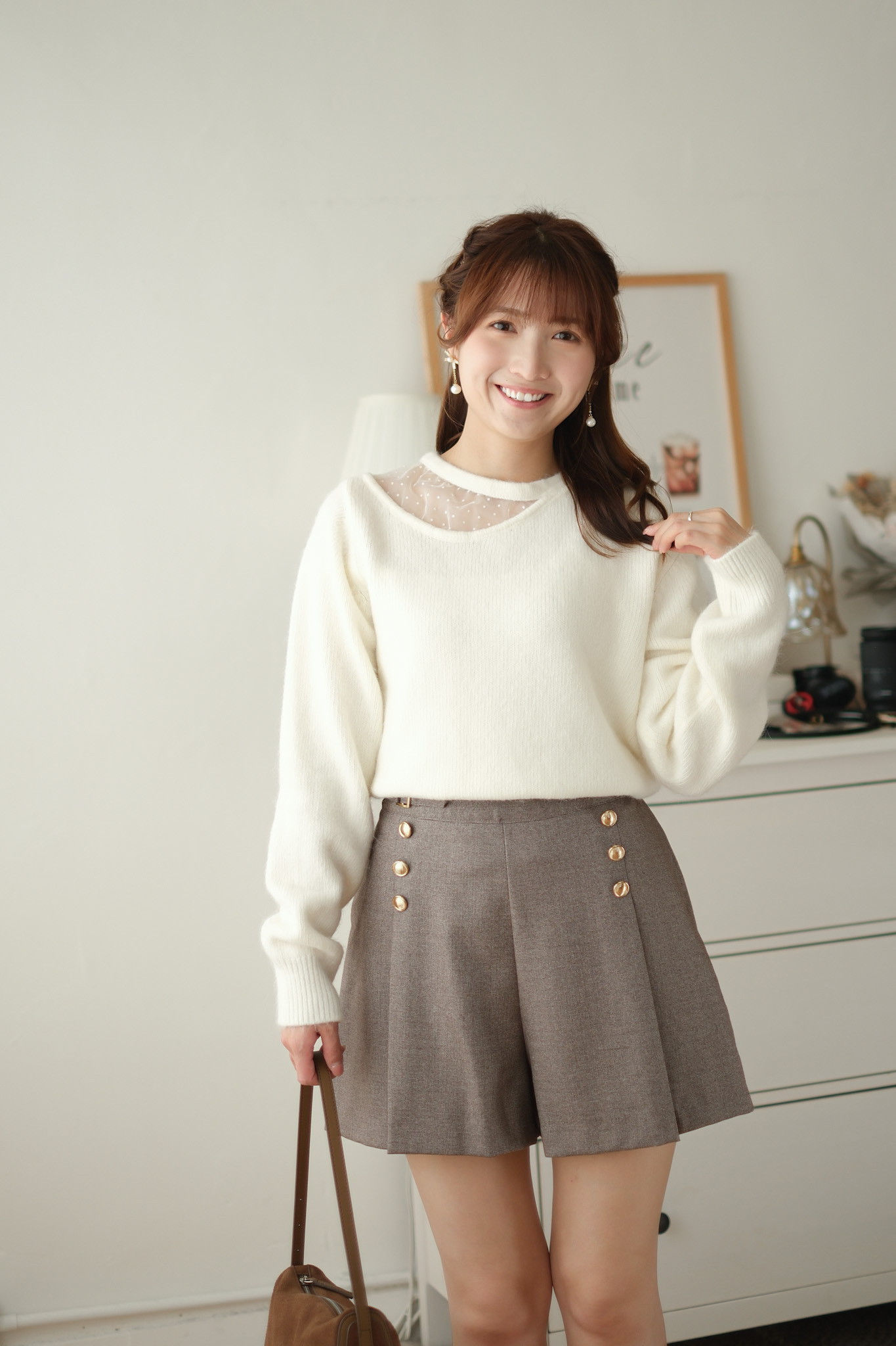 軟紗拼接圓領羊毛毛衣 (米白/黑) TOP612