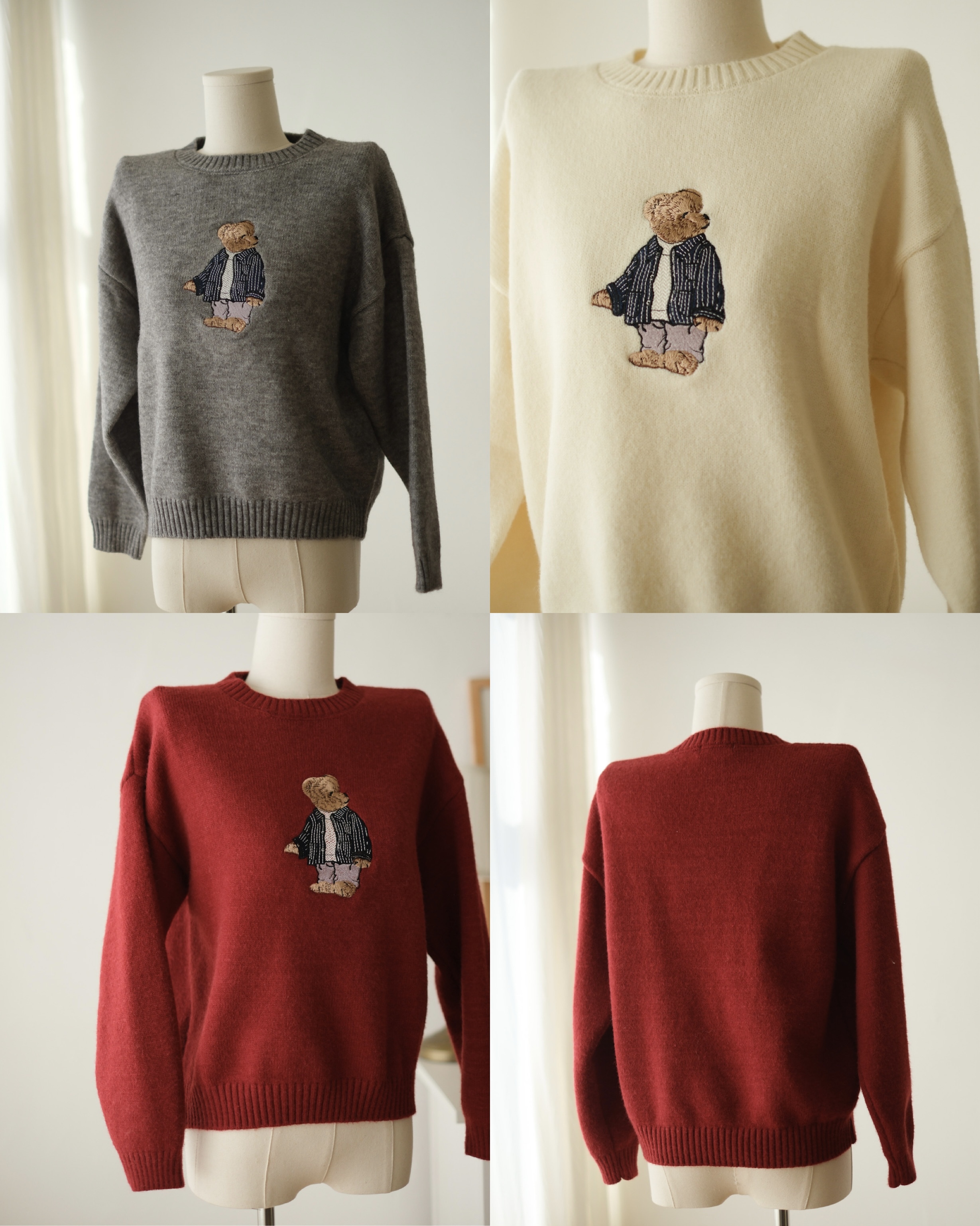 小熊刺繡圓領針織上衣 (米白/灰/紅) TOP618