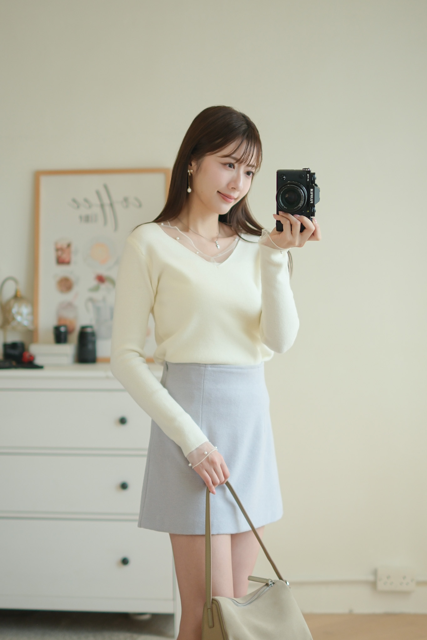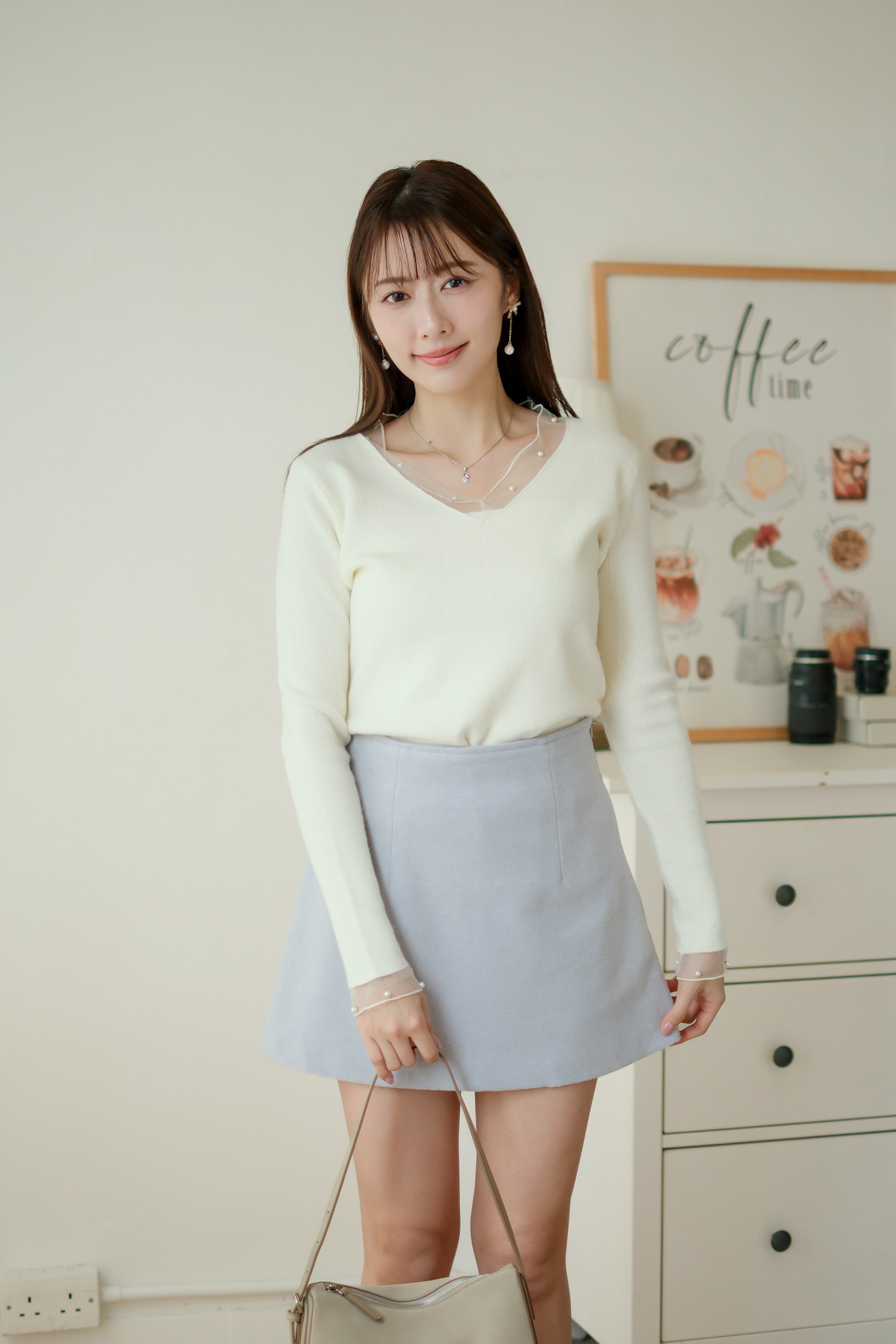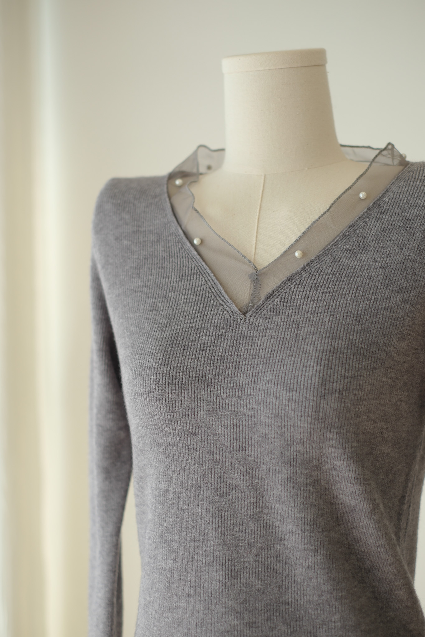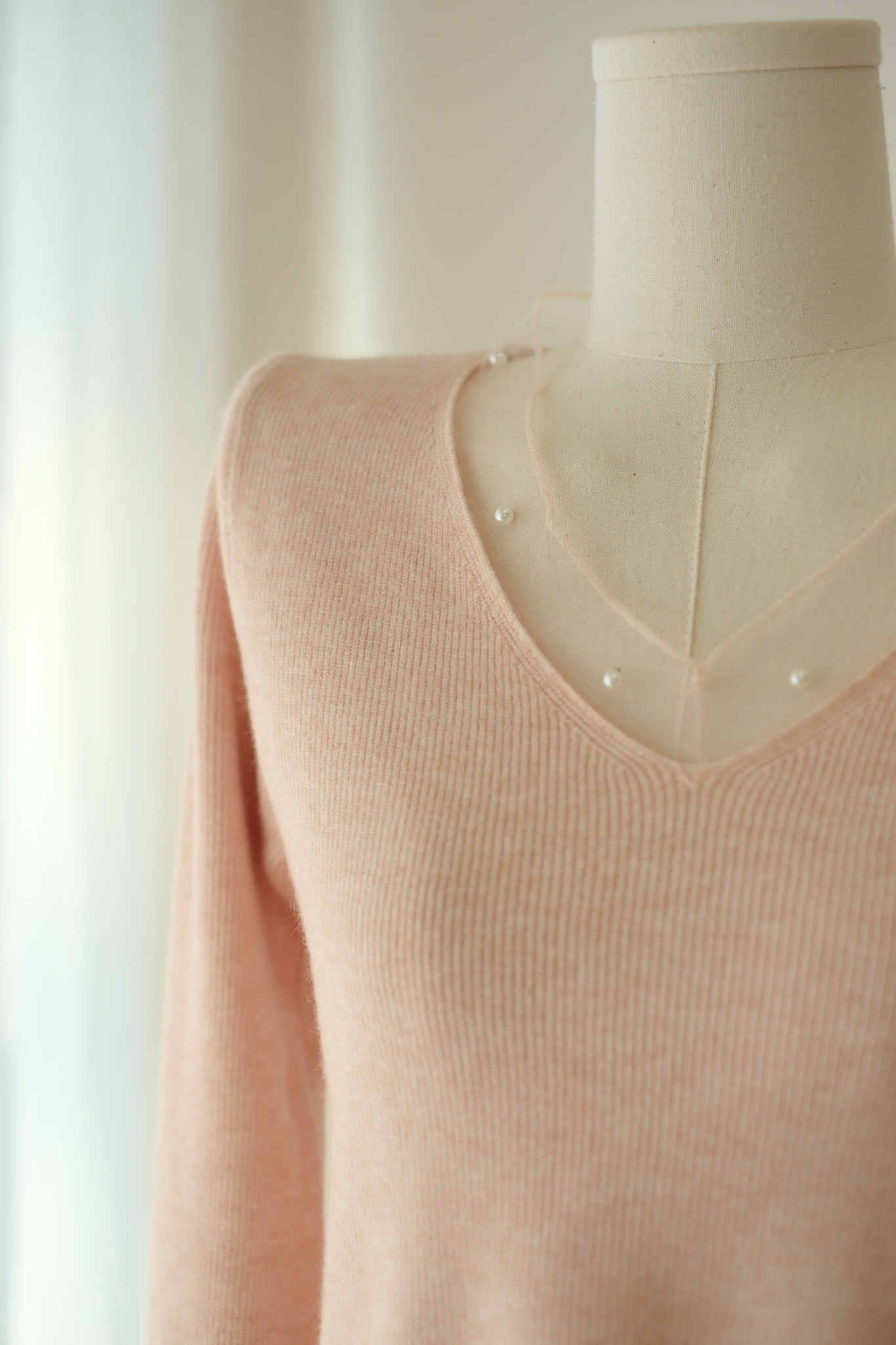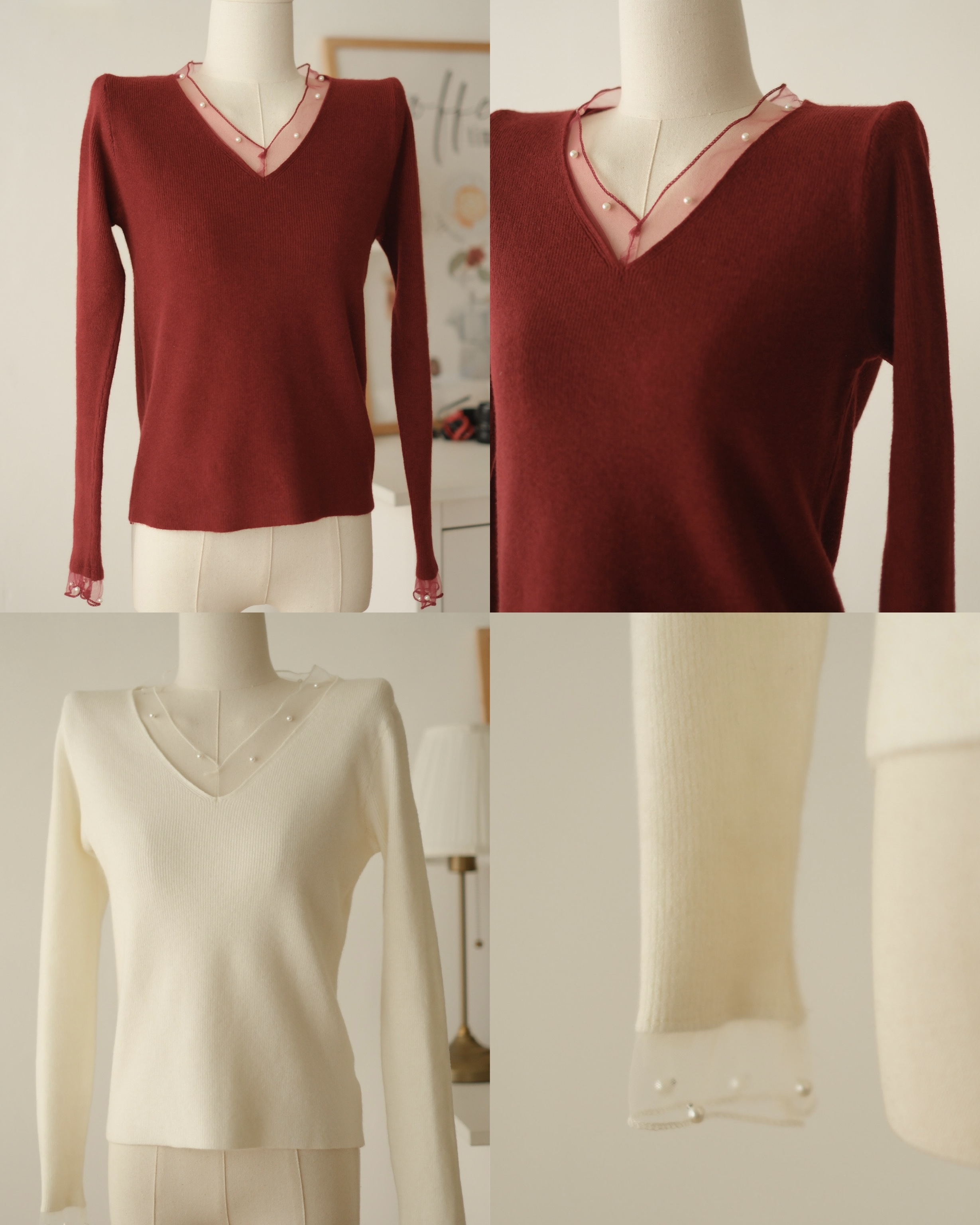軟紗小珍珠V領針織上衣 (米白/紅) TOP637