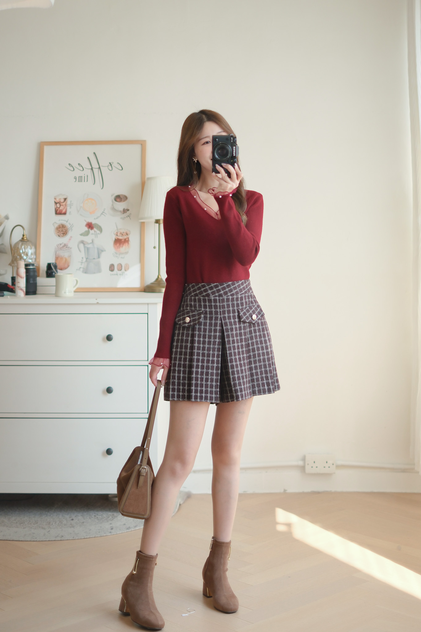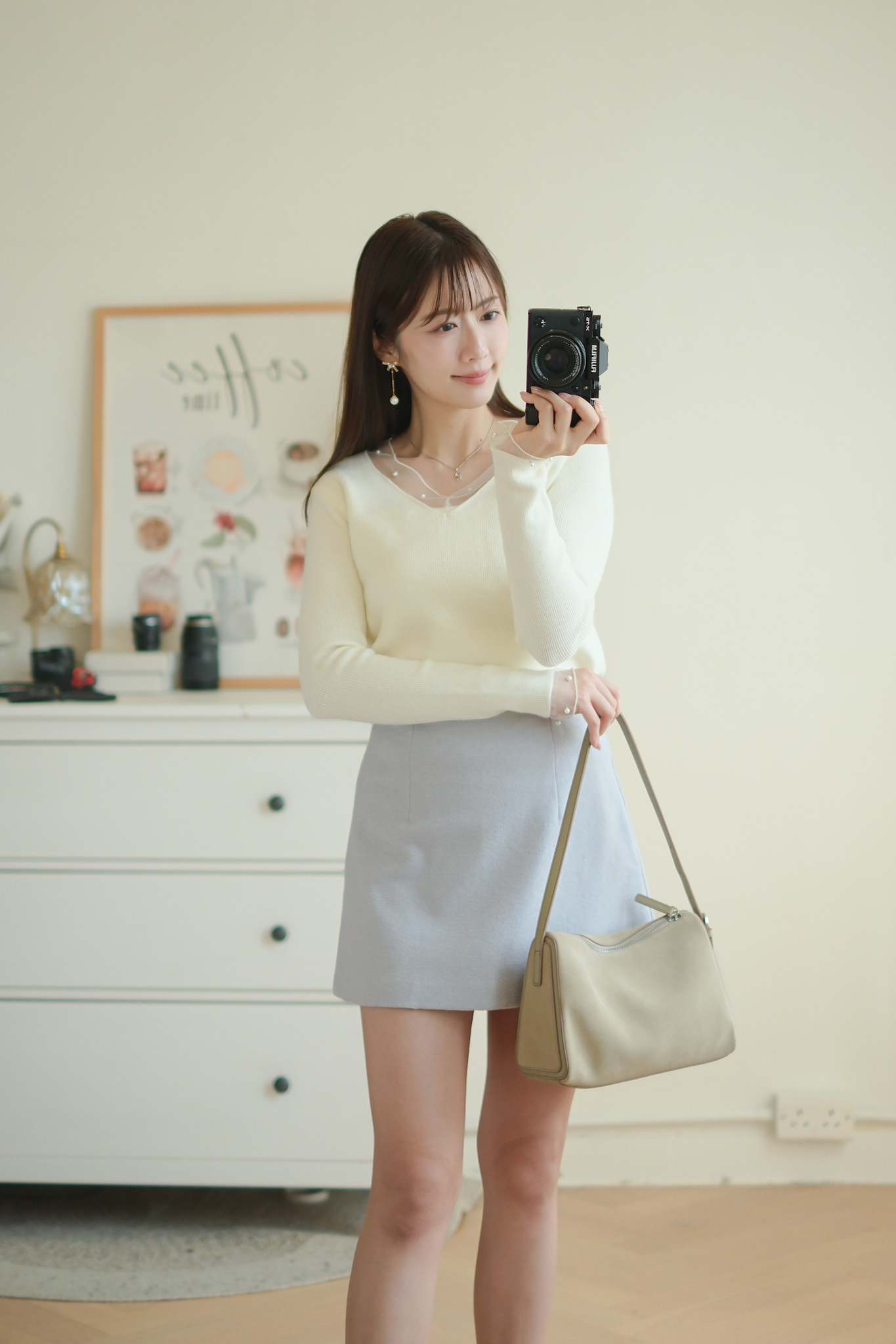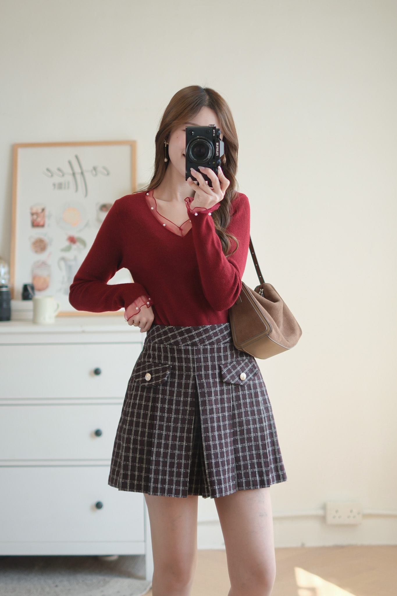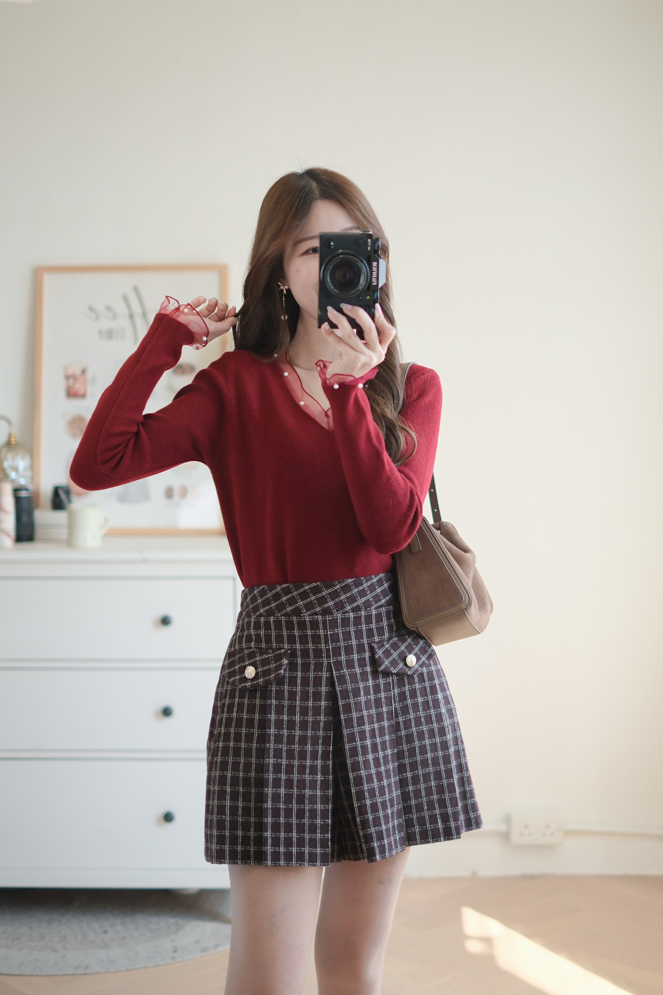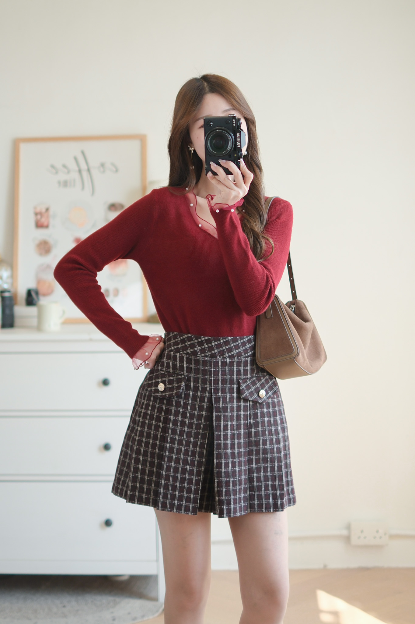 軟紗小珍珠V領針織上衣 (米白/紅) TOP637